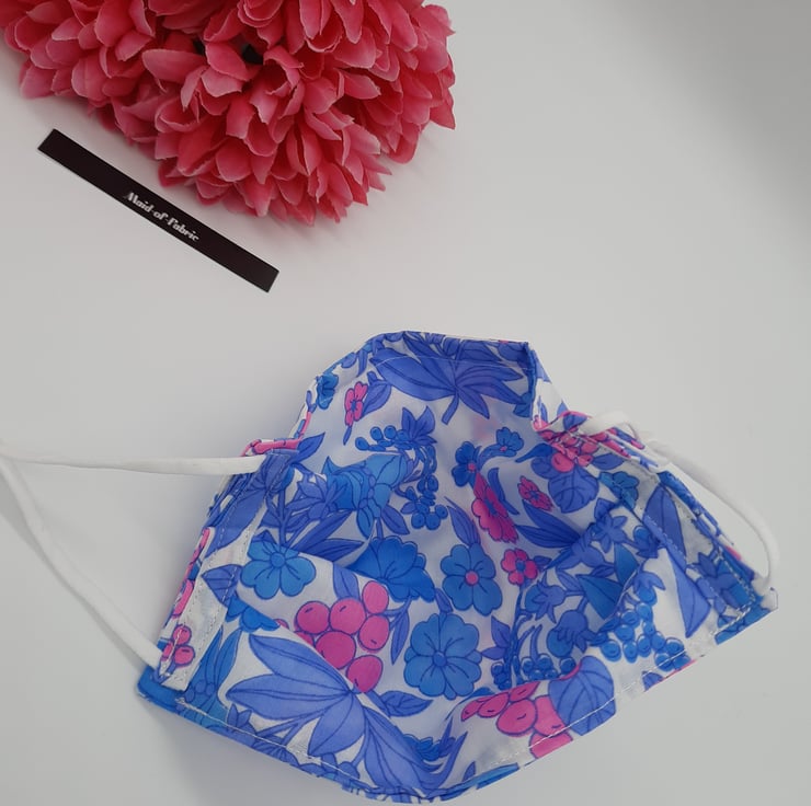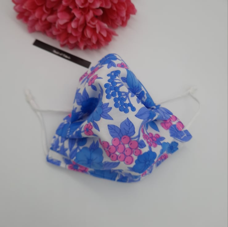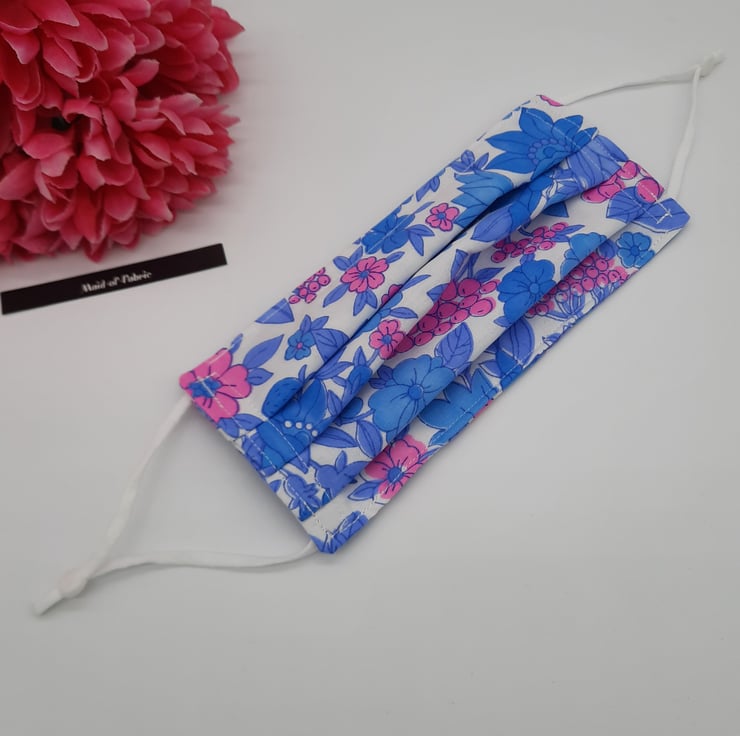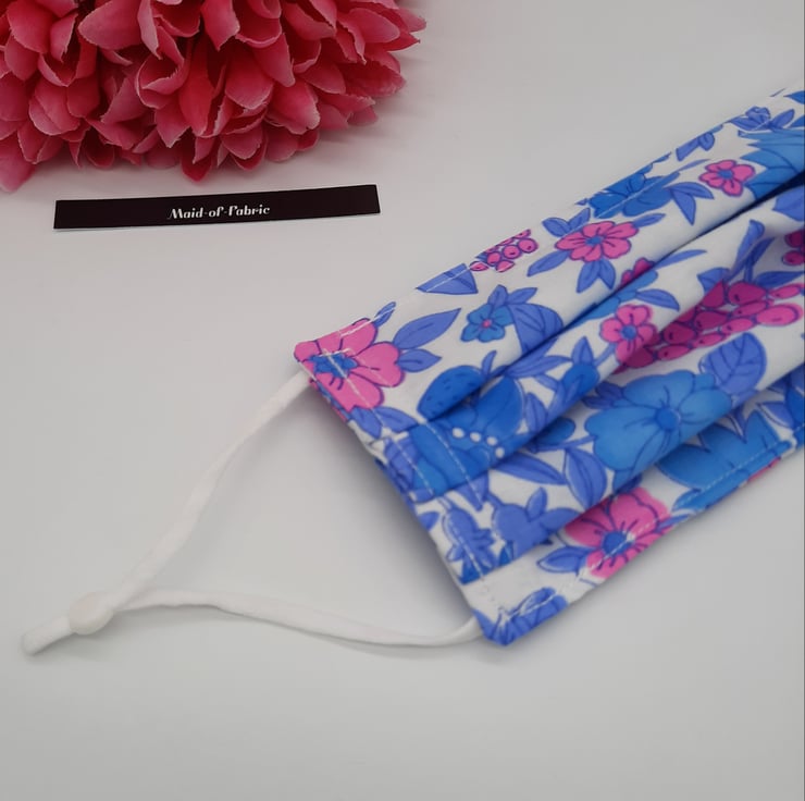 Face mask made using a soft blue and pink flower fabric, adjustable soft white elastic and a 9cm flat nose wire.