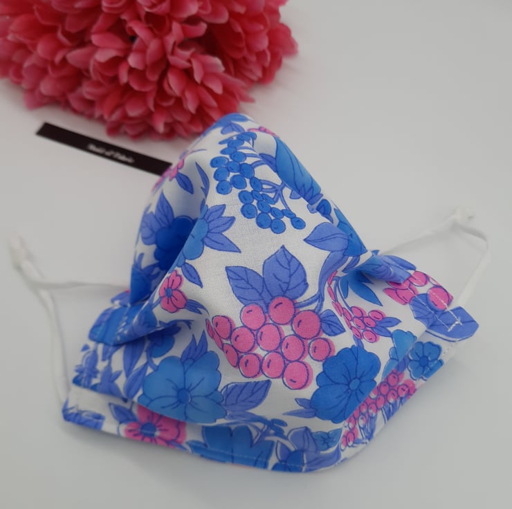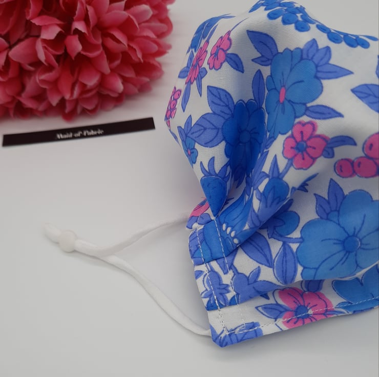 Face mask made using a soft blue and pink flower fabric, adjustable soft white elastic and a 9cm flat nose wire.