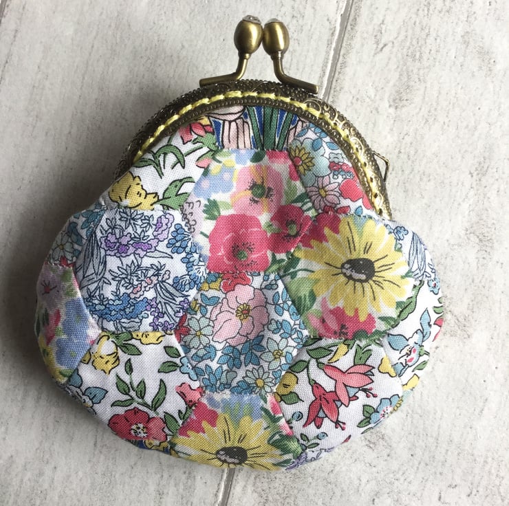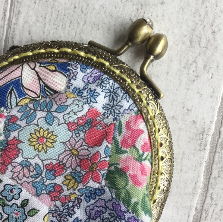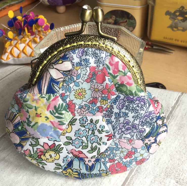 This delightful little coin purse in 5 Liberty print cottons is created from English paper pieced hexagons hand stitched to form the fabric in floral designs and hues of pinks, greens, blues, yellows and mauves on a white background.