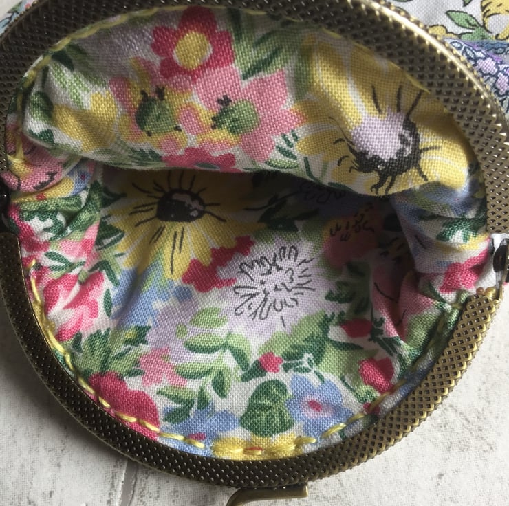 The antique bronze embossed metal clasp frame is attached to the purse with a yellow embroidery thread and the Liberty cotton floral lining is interfaced and my initial and year of creation stitched within it so that you know this is a Made in the Temple original.