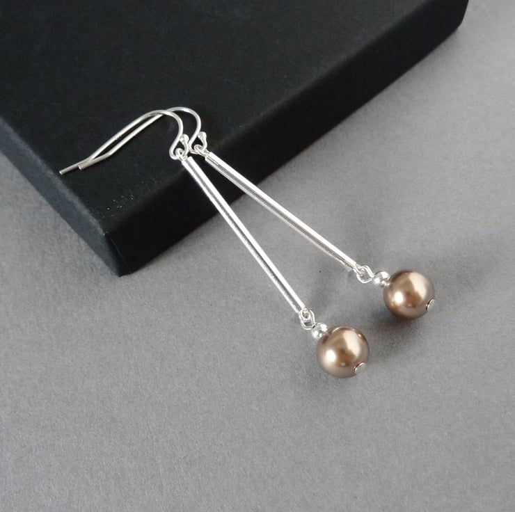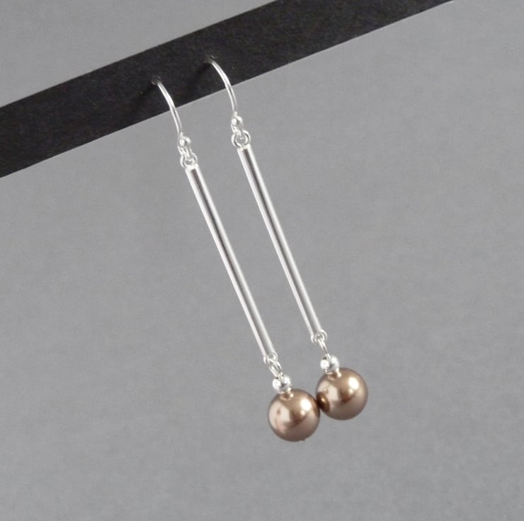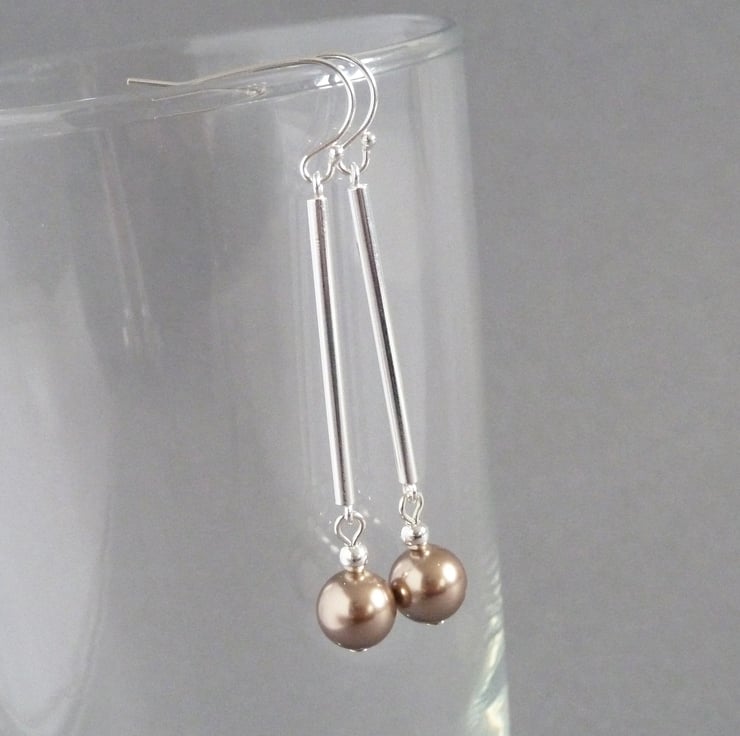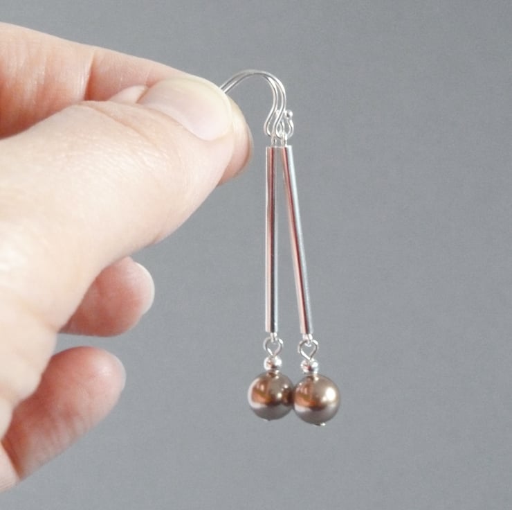 To create these long dangle earrings, I have used 8mm bronze glass pearls, which hang from long Sterling silver bars. Classic in design, these simple drop earrings make perfect gifts and are great for finishing off an outfit.