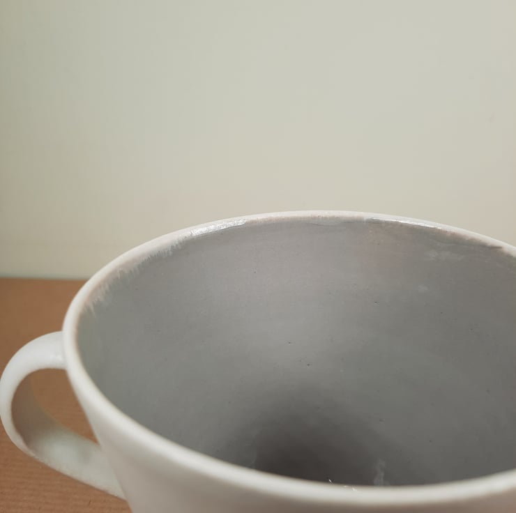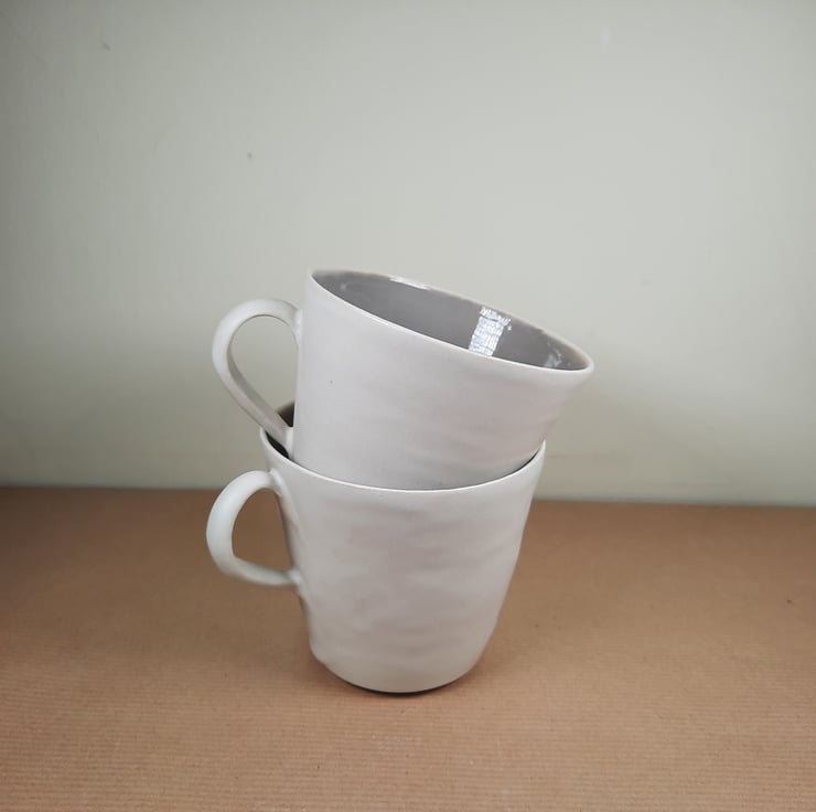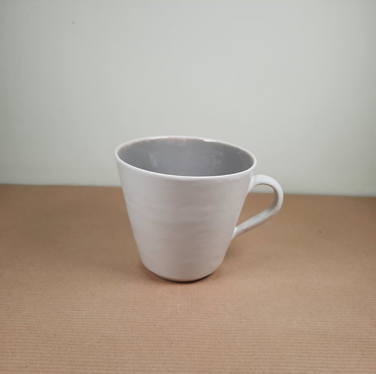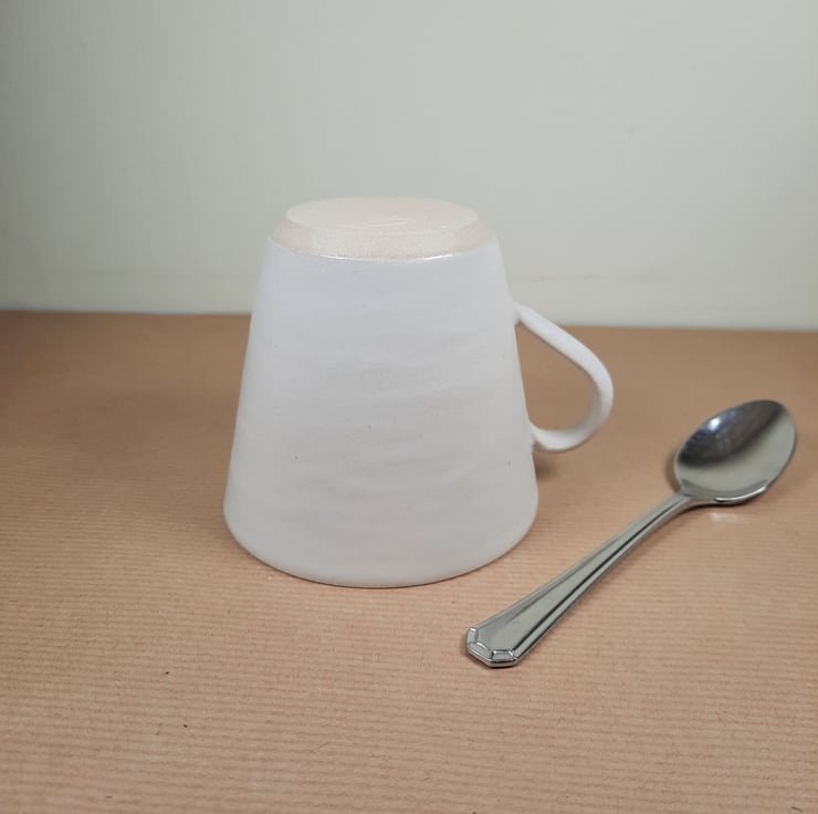 A short hand made ceramic mug. I have used a glossy taupe glaze on the inside and a satin white glaze on the outside. The mugs are made from stoneware clay fired to a high temperature allowing them to be hard wearing for daily use.