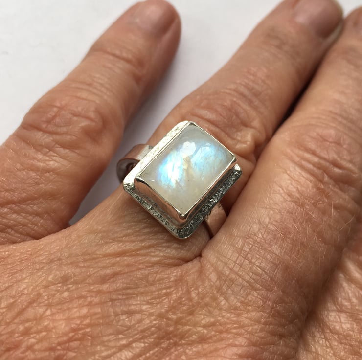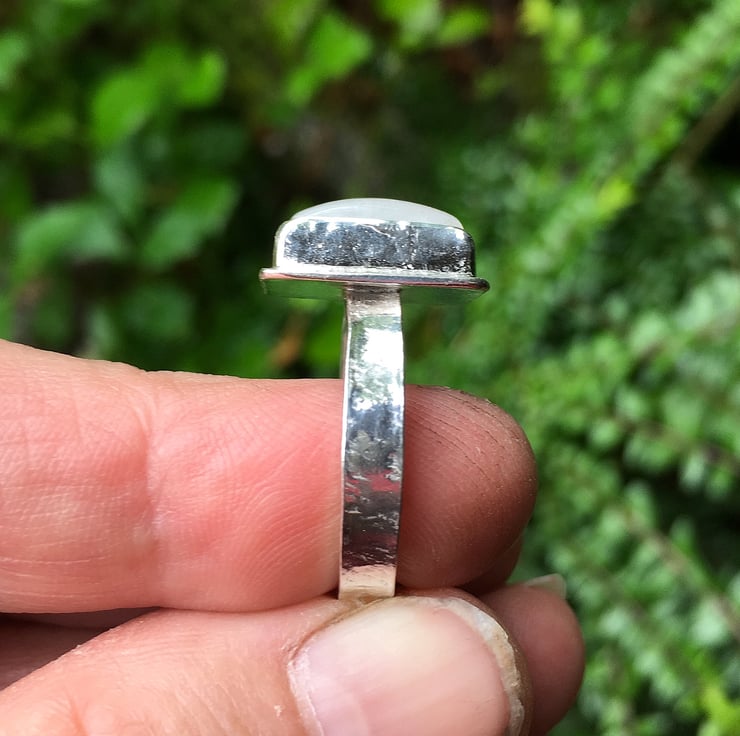 This statement moonstone is mostly opaque cloudy white, with an attractive silvery blue flash.