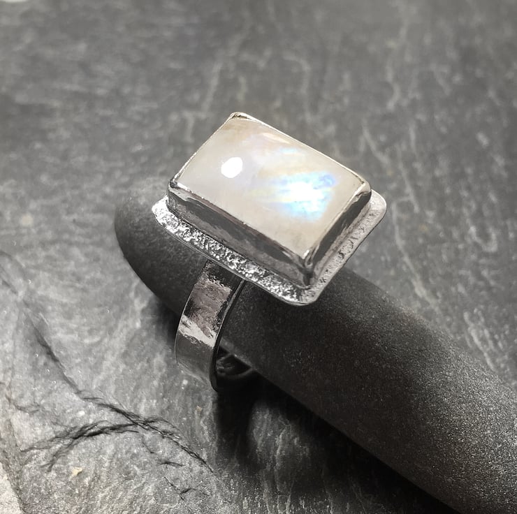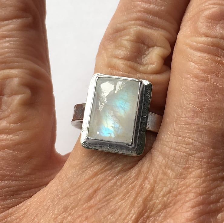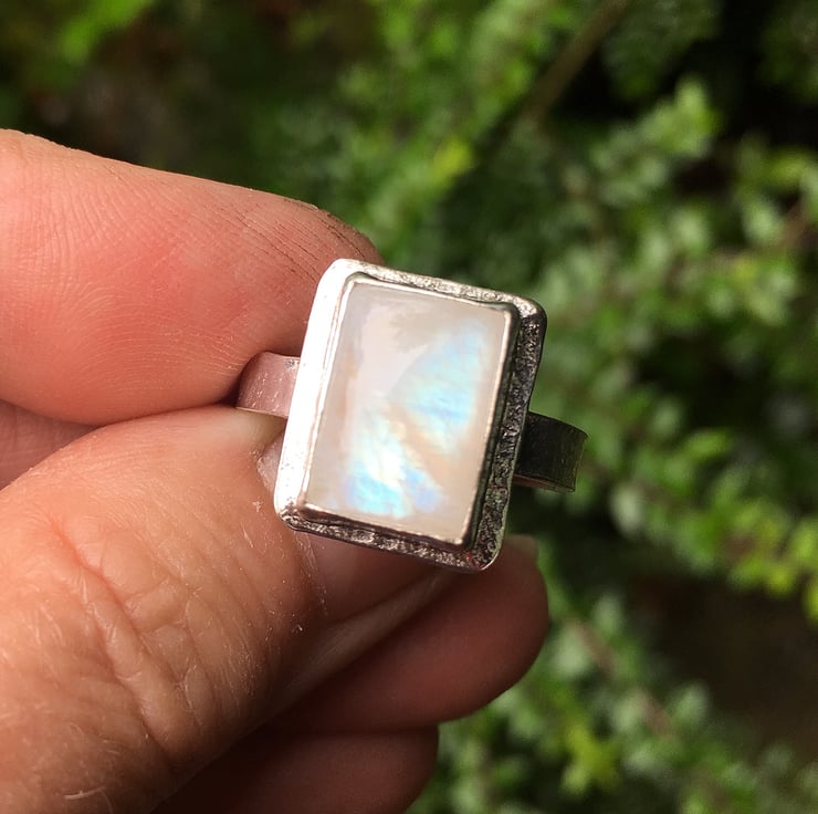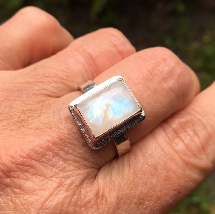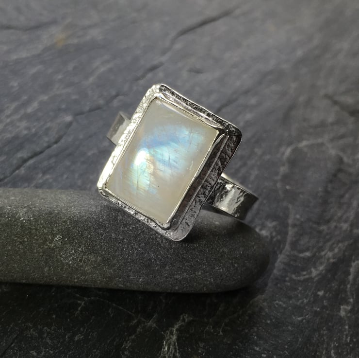 The silver has a beaten texture, and has been burnished to a bright finish. It is a fairly chunky ring, the shank is a comfort fit profile, D shaped with the curve on the inside.