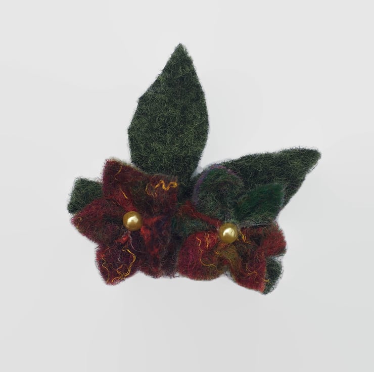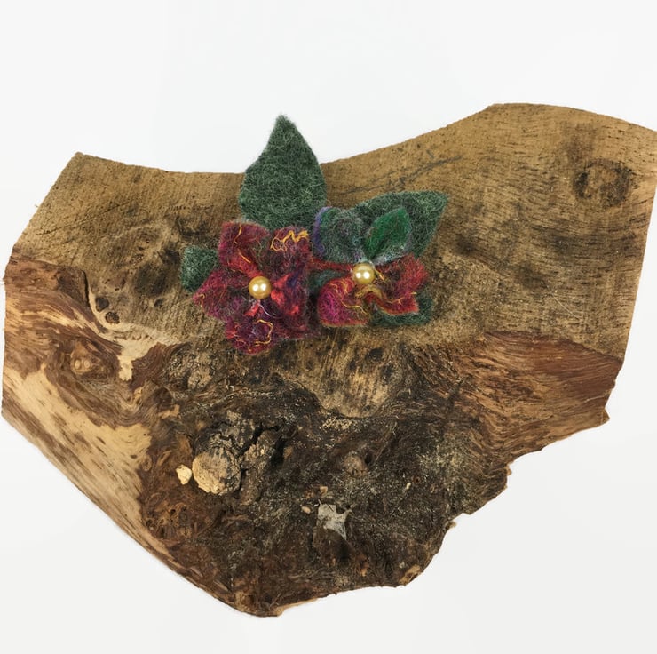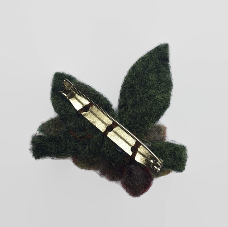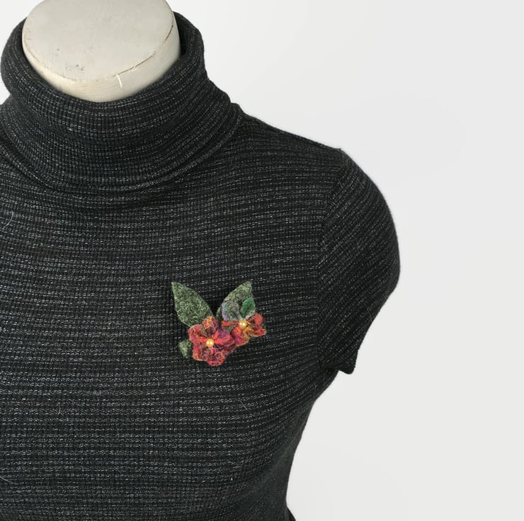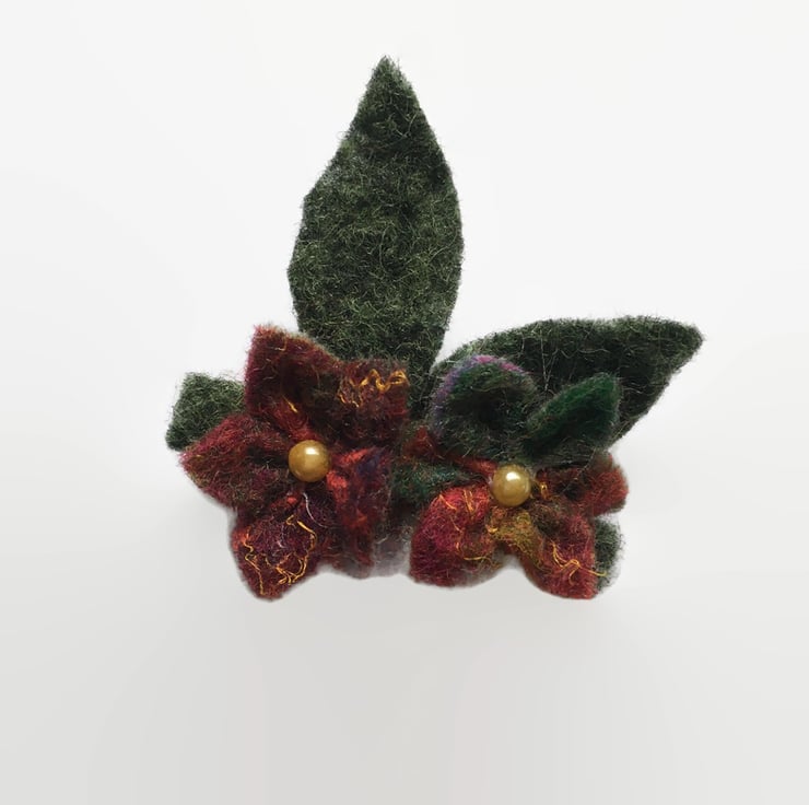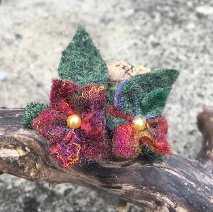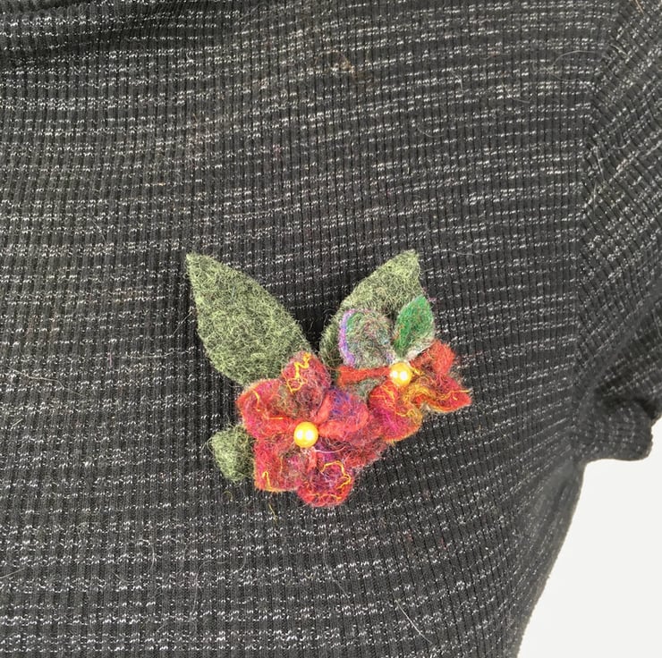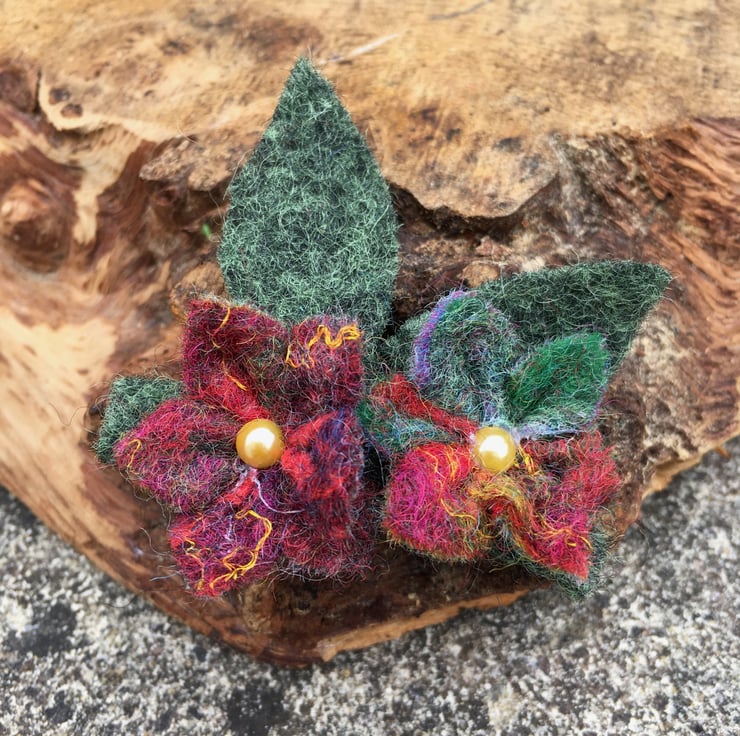 This lovely floral brooch has been made from hand made felt. it has been made to form two flowers and accompanying leaves with a short stem. The flowers are multicoloured and have a golden yellow acrylic pearl centre. Once assembled the flower arrangement has been attached to a large silver tone brooch pin. A great accessory for any outfit which could also be used to decorate a bag or hat. The brooch measures approximately 5cm x 5cm (2" x 2").