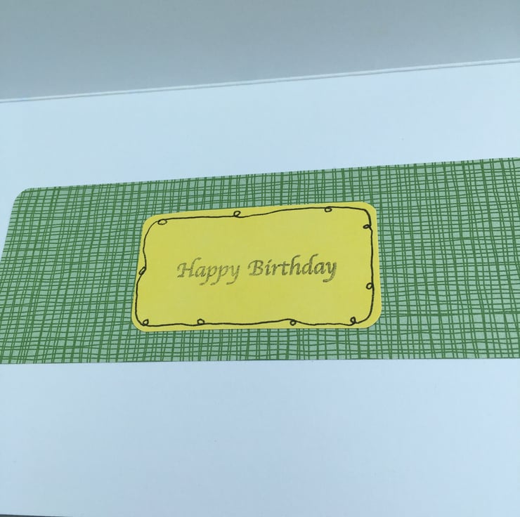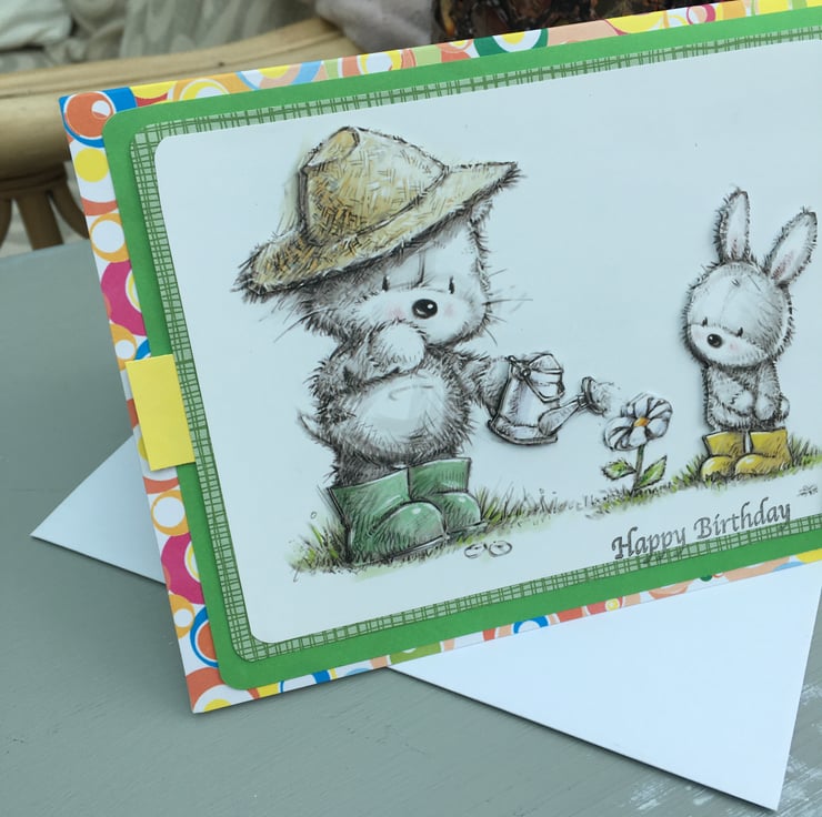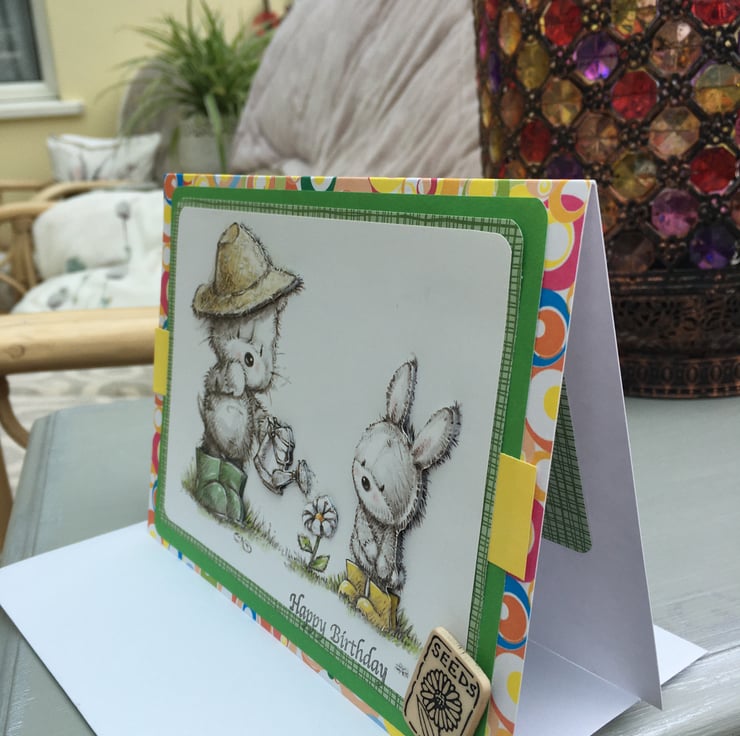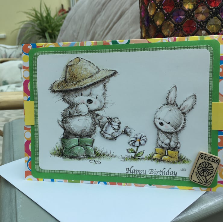 A super cute bear and bunny tending their little garden, well, one little flower! Both charactures are dressed for the part, each with their colourful wellies, no one wants to get messy in the garden. The topper is layered onto coordinating green and yellow paper and the card is a vibrant almost psychodelic design, cheerful and fun. The card is finished with a small happy birthday greeting and a seed packet fancy button. Inside has matching papers and a happy birthday greeting. This card really doesn't suggest gender, just a love for the outside world. So go on, send your little one a lovely card for their special day.
