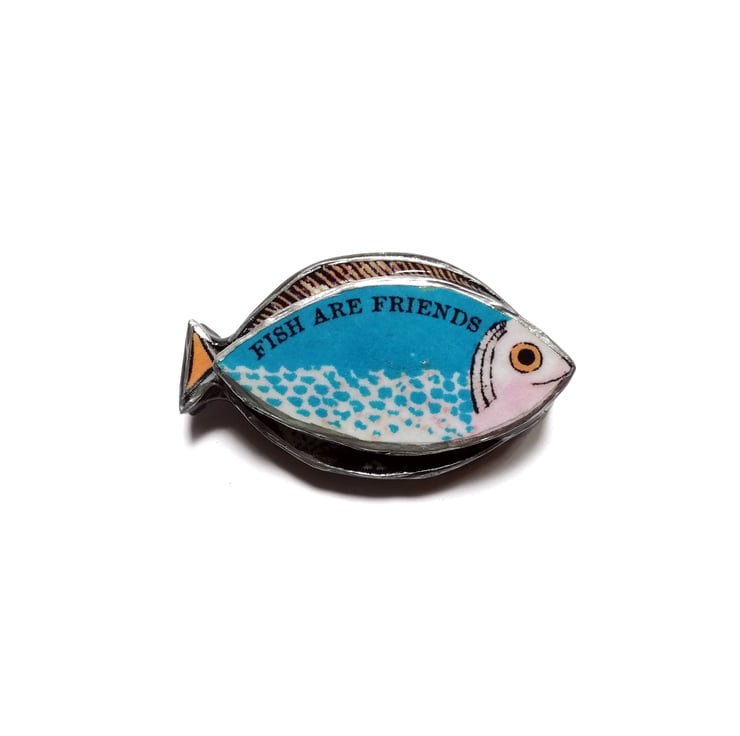 This 'Fish are Friends' Brooch measures approx 5cm x 3cm and is 5mm thick. The centre 'body' part of the fish is layered and protrudes out another 2-3mm. Available in green or blue,
