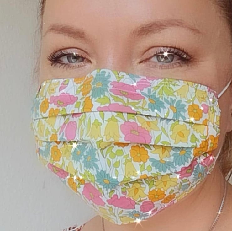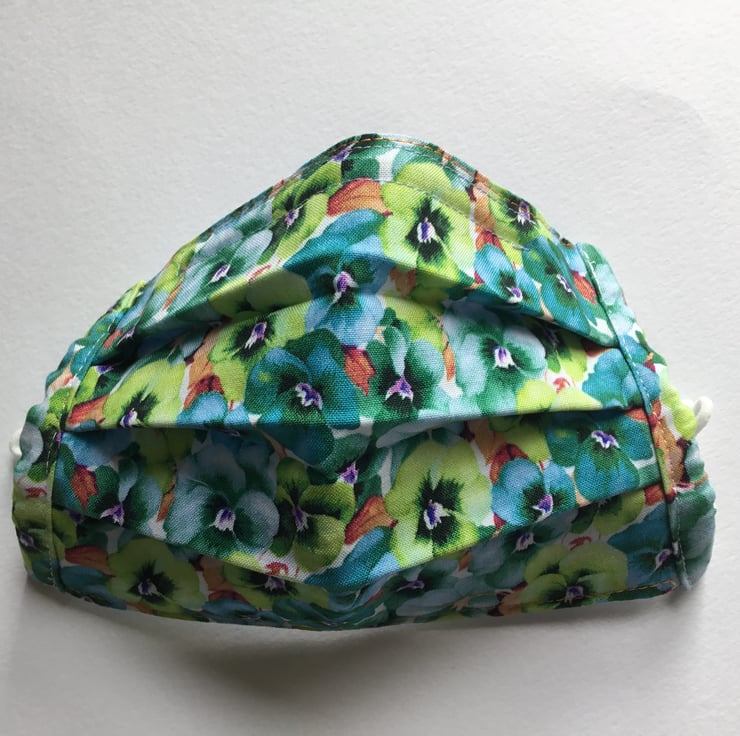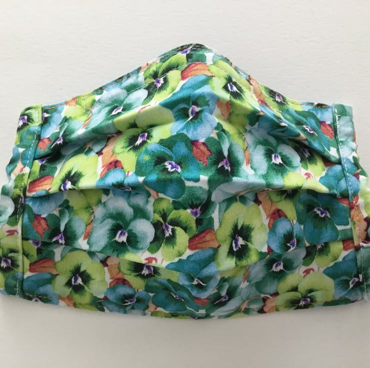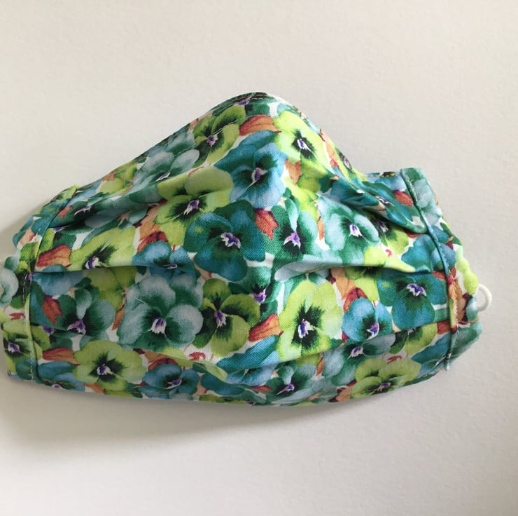 Pretty pansy fabric by John Louden face covering made with 3 layers of cotton. Lined with a complementary lining. Comes with removable nose wire, which should be removed prior to washing and elastic ear loops with 30cm each side for you to adjust to size.