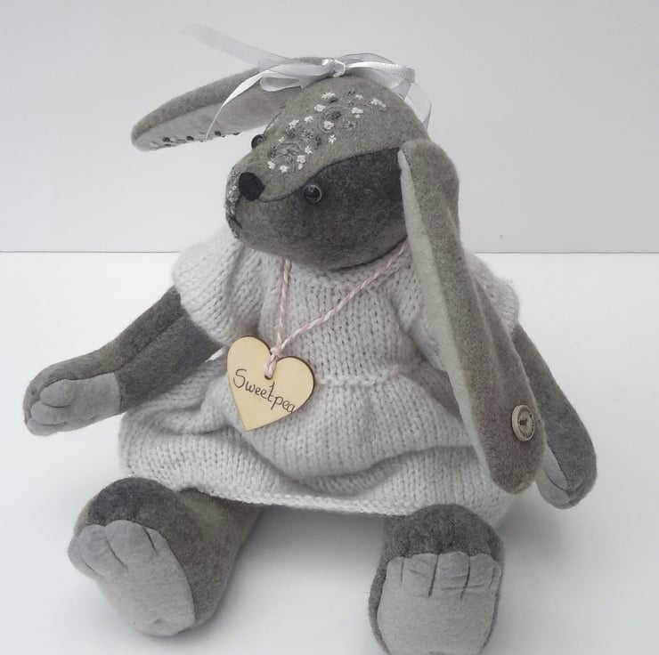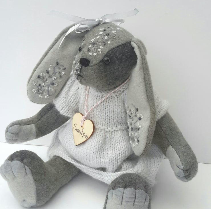 I am a loveable bunny and my creator designed me with the adult collector in mind, I would make an extra special gift but please don't adopt me for a child to play with. Although I am very well sewn I wouldn't like my long ears pulling, but I do give lovely hugs.