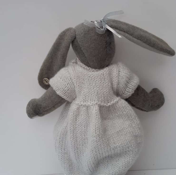 My dress was hand knitted from a very pale silver grey dk yarn and I wear a double ribbon bow over one ear.