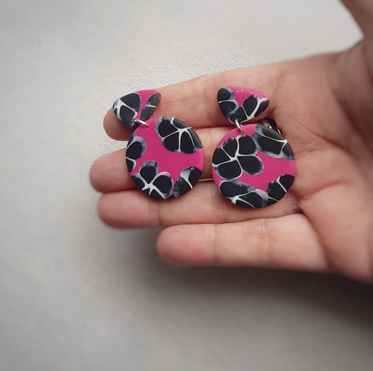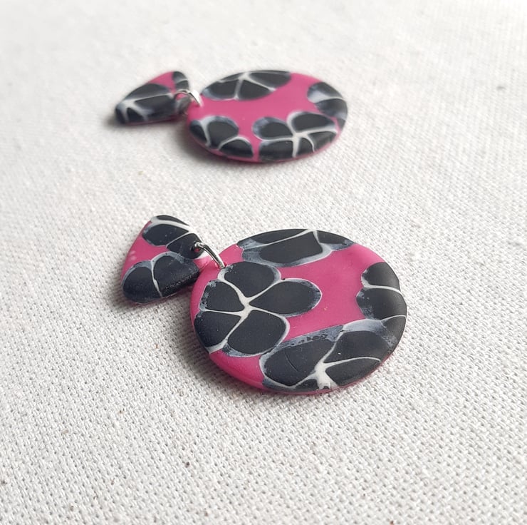 Black & white abstract flower design on pink background earrings, Pink polymer clay dangles, Monochrome floral, Pink and black circle earrings