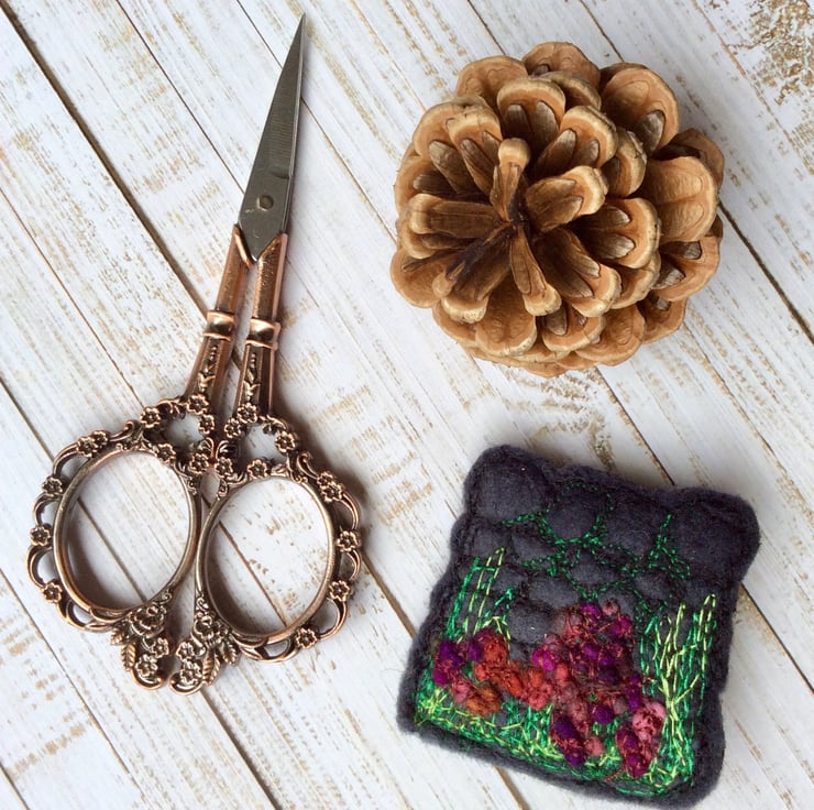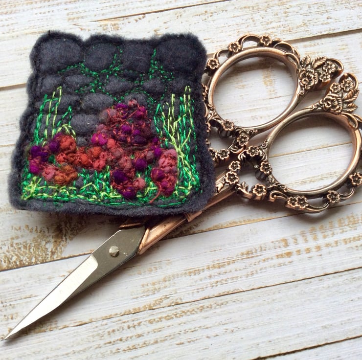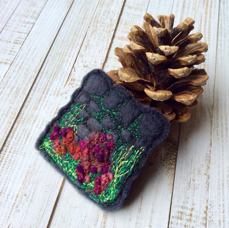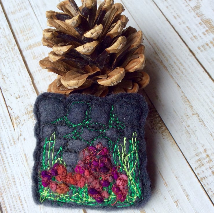 This intricate and detailed embroidered brooch shows a Yorkshire dry stone wall with hedgerow plants and flowers below. It incorporates wet felting, needle felting and free motion embroidery. Measurements are 5 x 5cm approx.