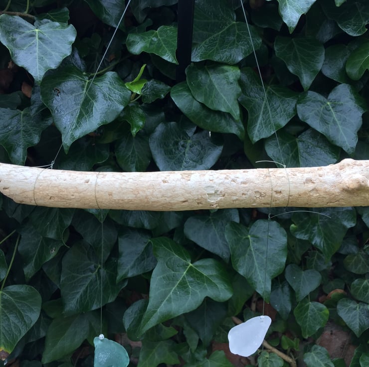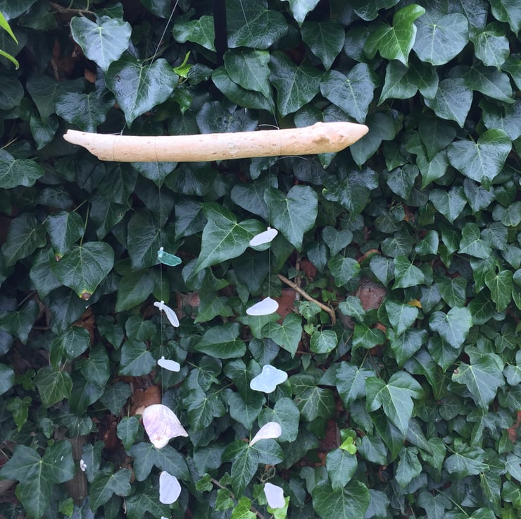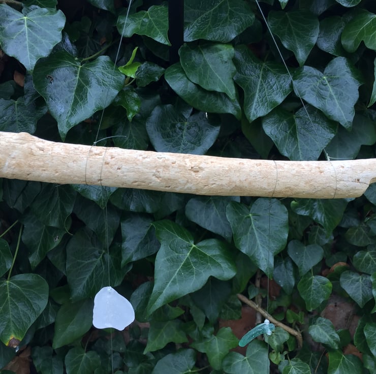 This suncatcher is made with home bleached driftwood found at Fraisthorpe beach with two strands of locally sourced seaglass mounted on unwanted and unused fishing line. The driftwood mount is approx 28cm in length with a nylon line hanger. The seaglass is held in place using beads as stoppers; a part shell is tied onto both lines, see photo. The strands are approx 42 & 43cm in length.