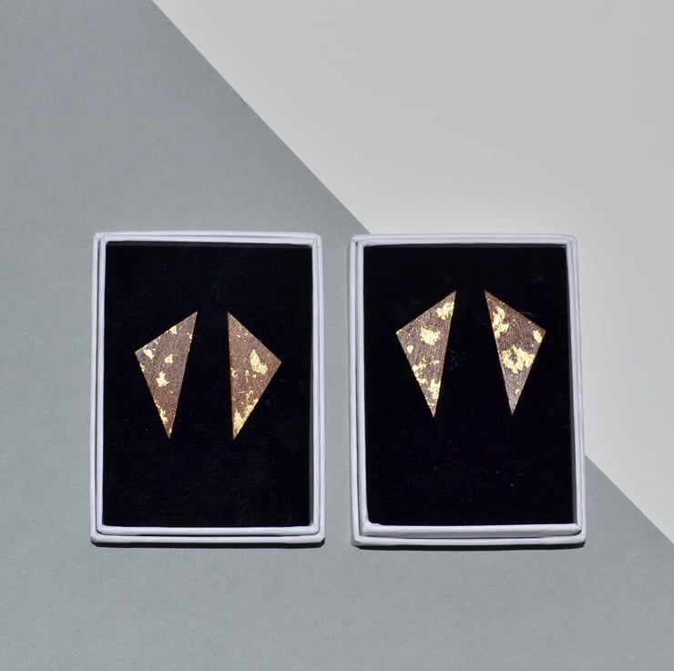 These triangle shaped stud earrings are made from a laser cut walnut wood shape with hand applied gold leaf, which really shines beautifully when it catches the light.
