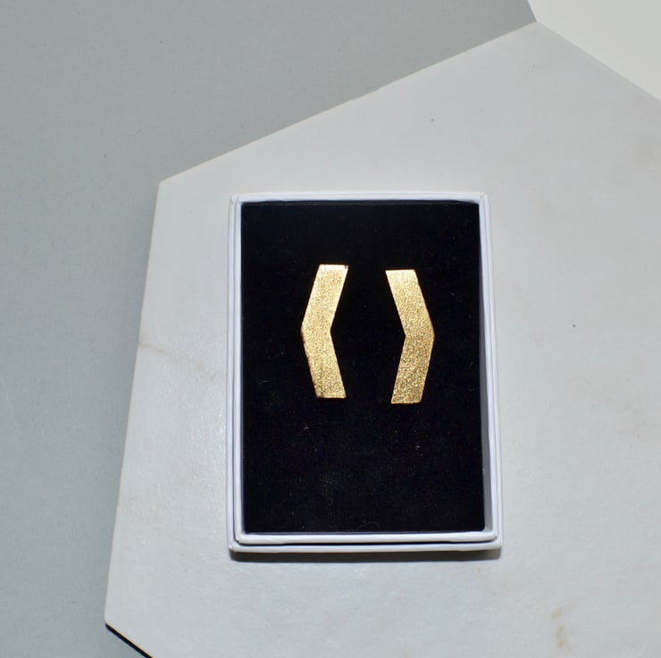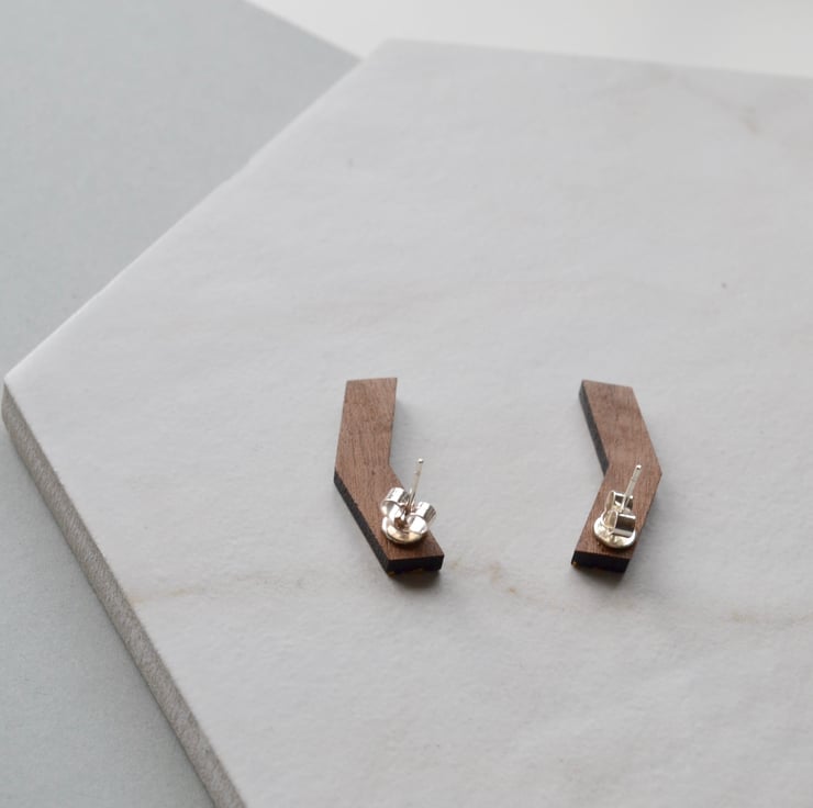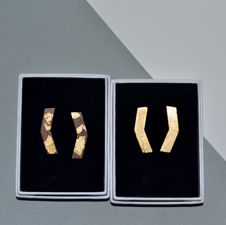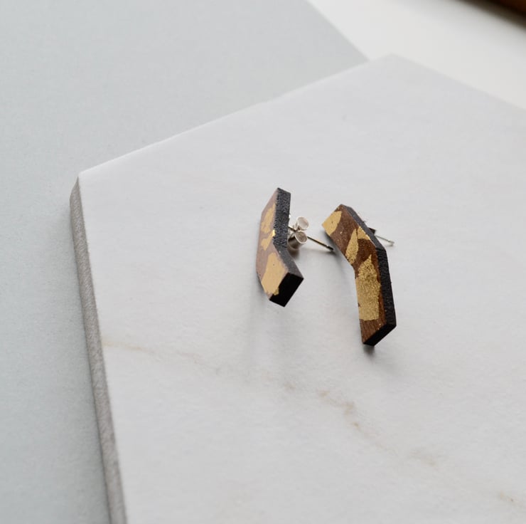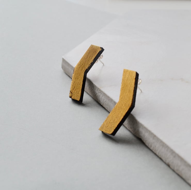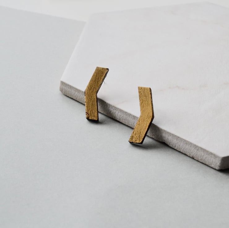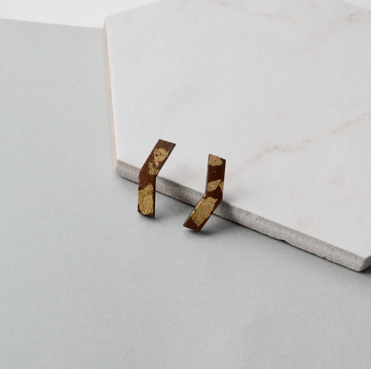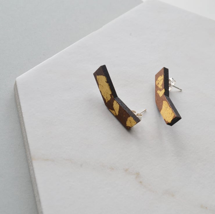 These chevron shaped stud earrings are made from a laser cut walnut wood shape with hand applied real gold leaf, which really shines beautifully when it catches the light.