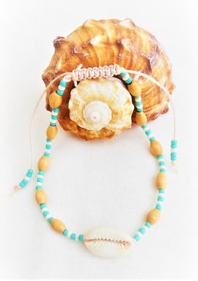 A beaded ankle bracelet featuring wooden rice beads, glass seed beads with a central focal natural cowrie shell. These are threaded onto strong ivory coloured S- lon cord .
