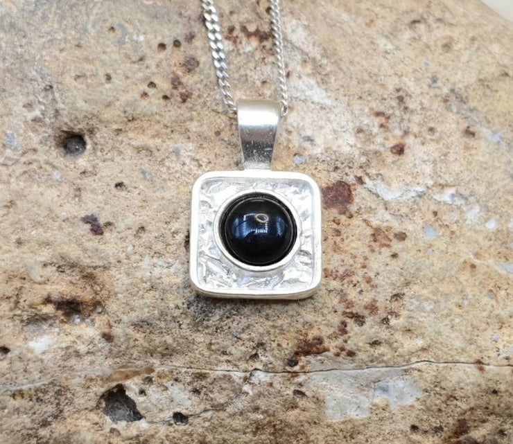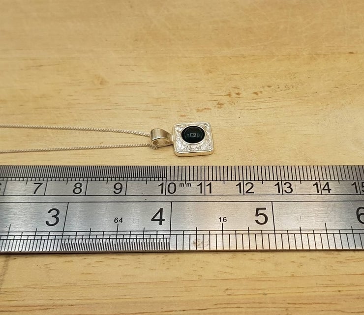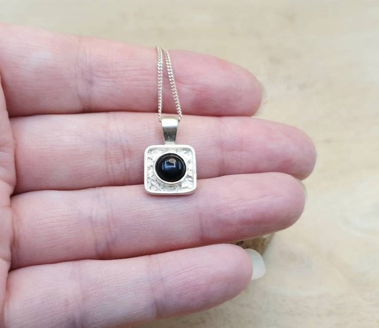 This is a tiny minimalist sterling silver square black onyx pendant necklace.