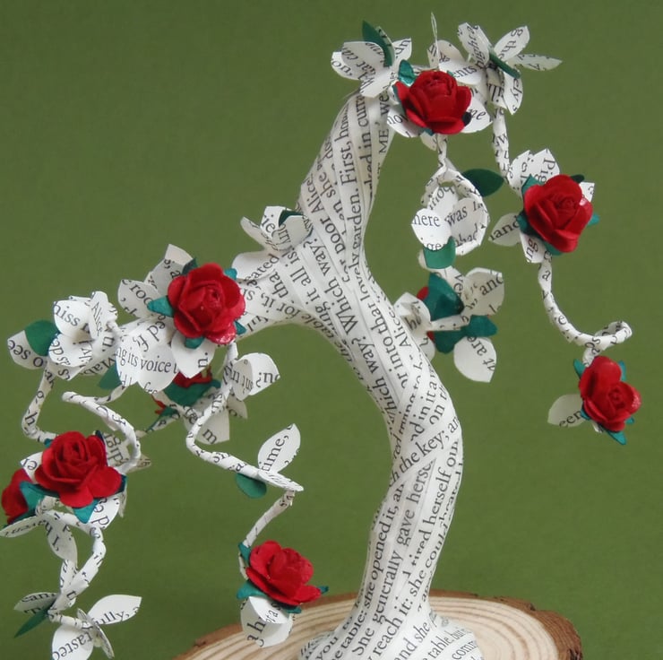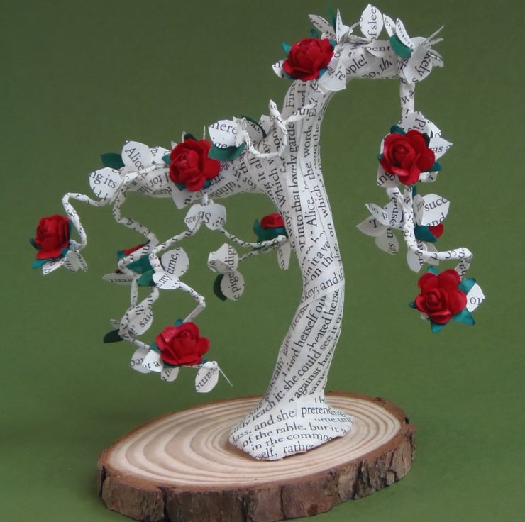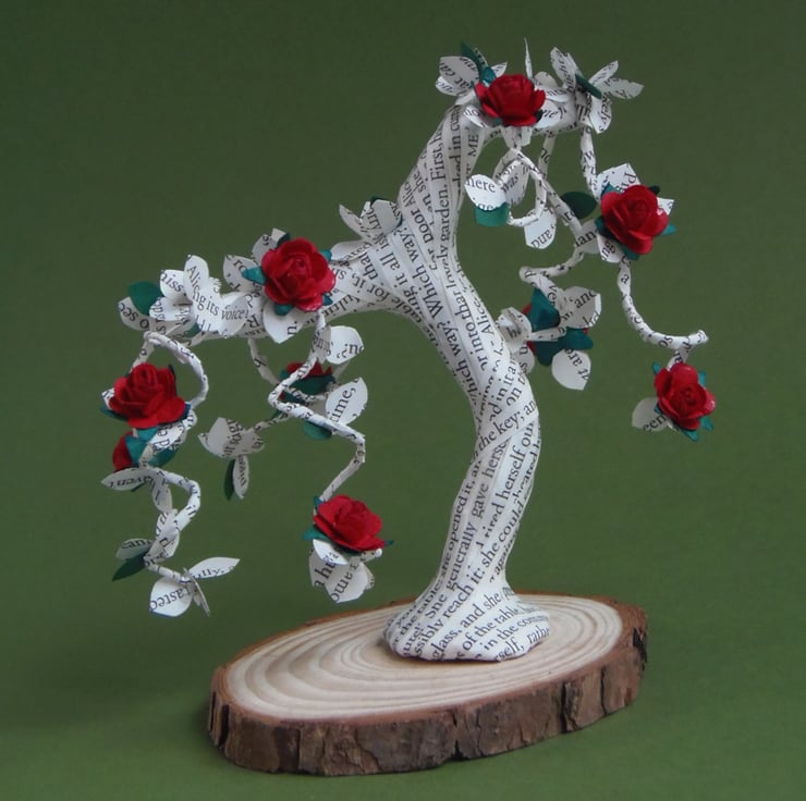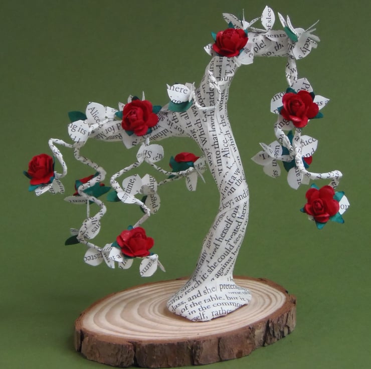 This literary bonsai tree has been decorated with little red mulberry style paper roses.