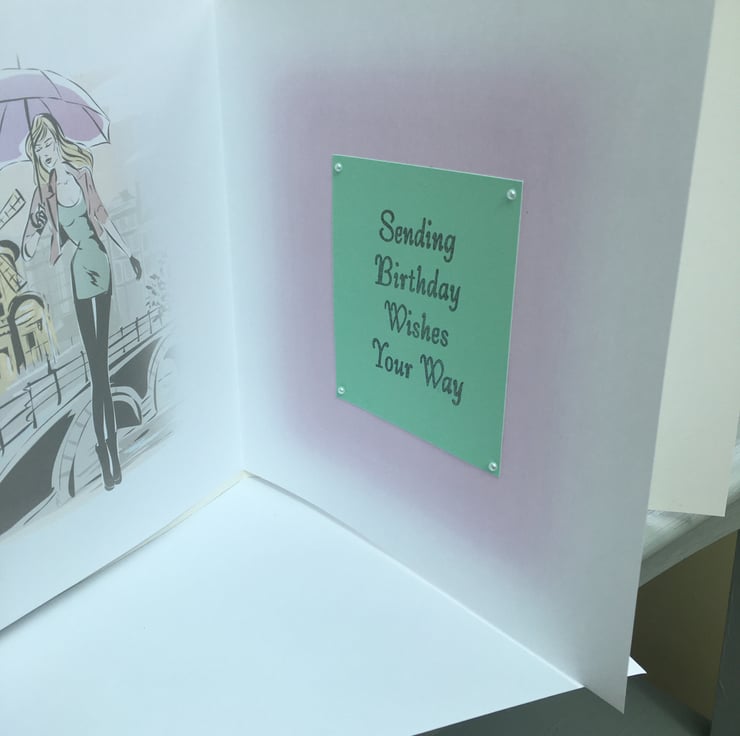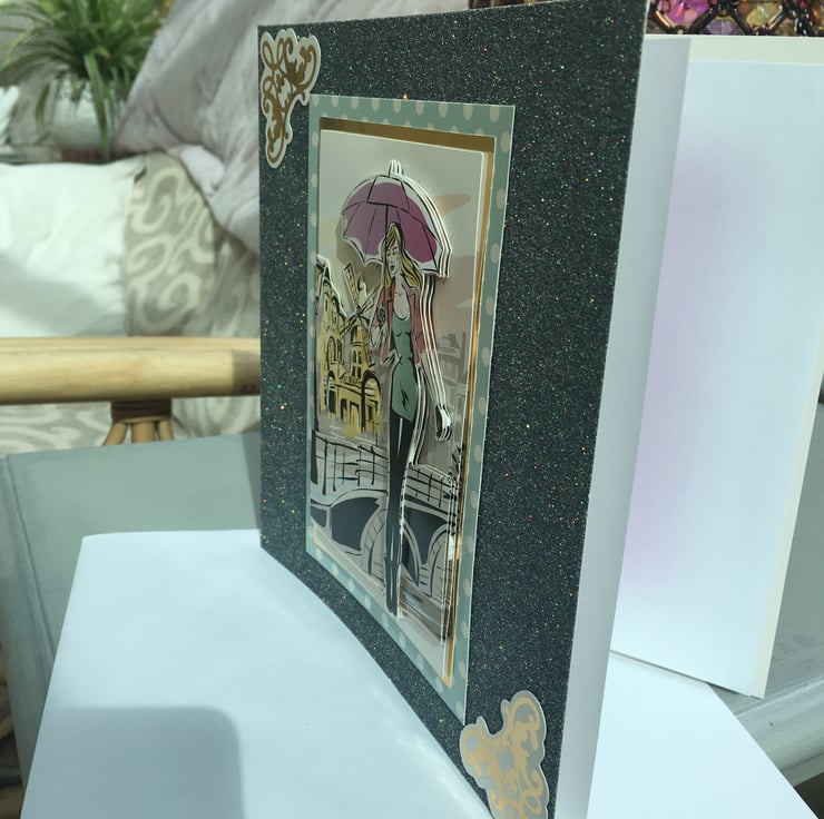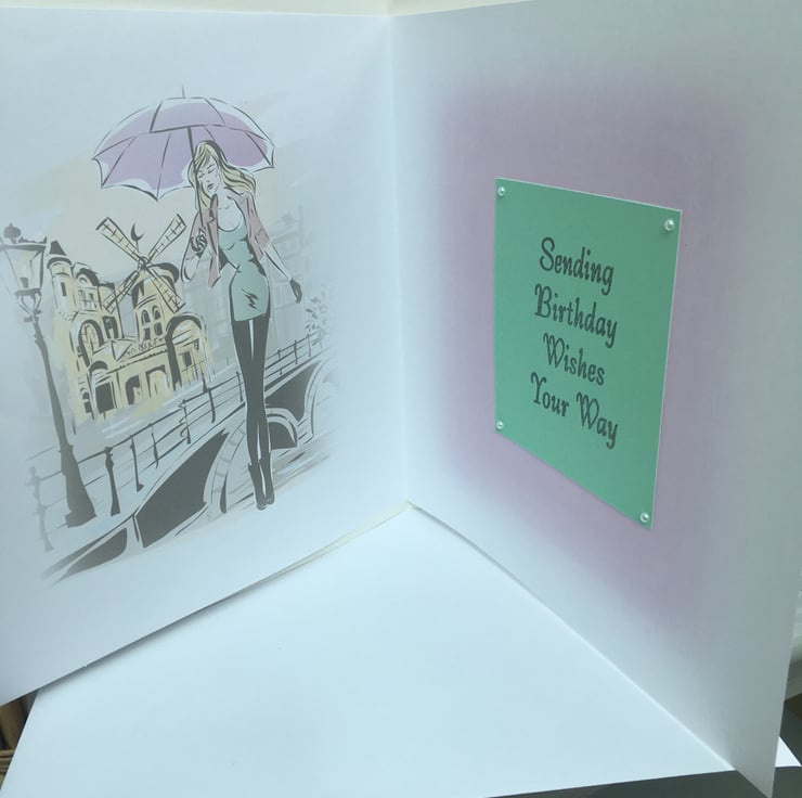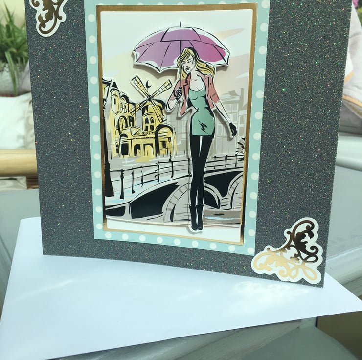 A beautiful glitter card with a lovely young thing dashing through the rain. A beautifully attired fashionesta in the streets of Paris. The Moulin Rouge is in the background and she is standing by the Seine, a little fanciful but a lovely card. The card base is a blue green glitter. The main picture is on gold mirroe card on blue polka dot card. 2 gold fancy corners finish the design. A matching insert is inside and has the greeting Sending birthday wishes your way.