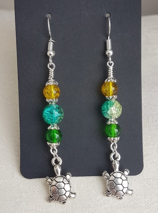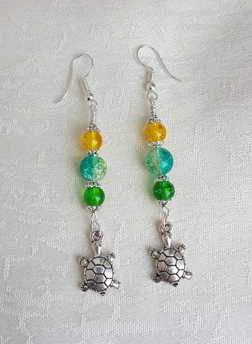 Tortoise charms are Tibetan Silver. Beads are Yellow, Turquoise/green and Lime green crackle glass. Ear wires are silver tone stainless steel. If you would like Sterling Silver Ear Wires please use the Choose Options box near the top right of this page to make your selection. Pic 5 & 6 show the choice of ear wires whilst available.