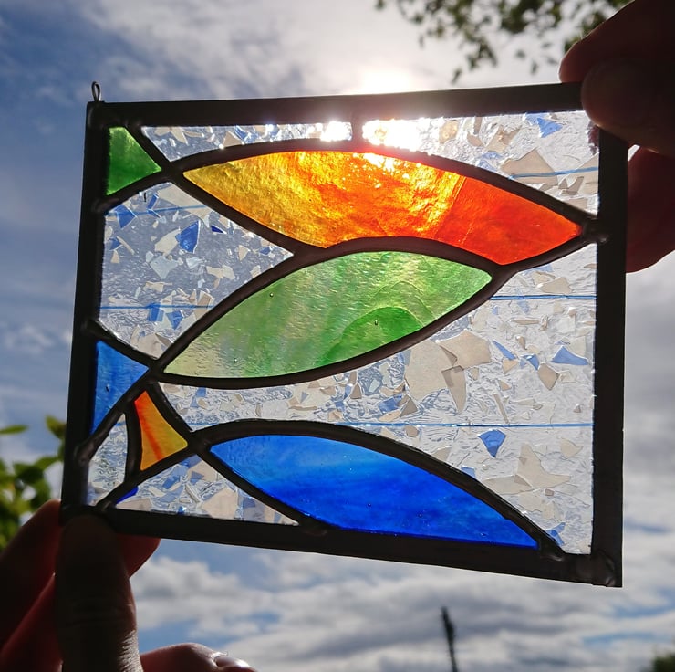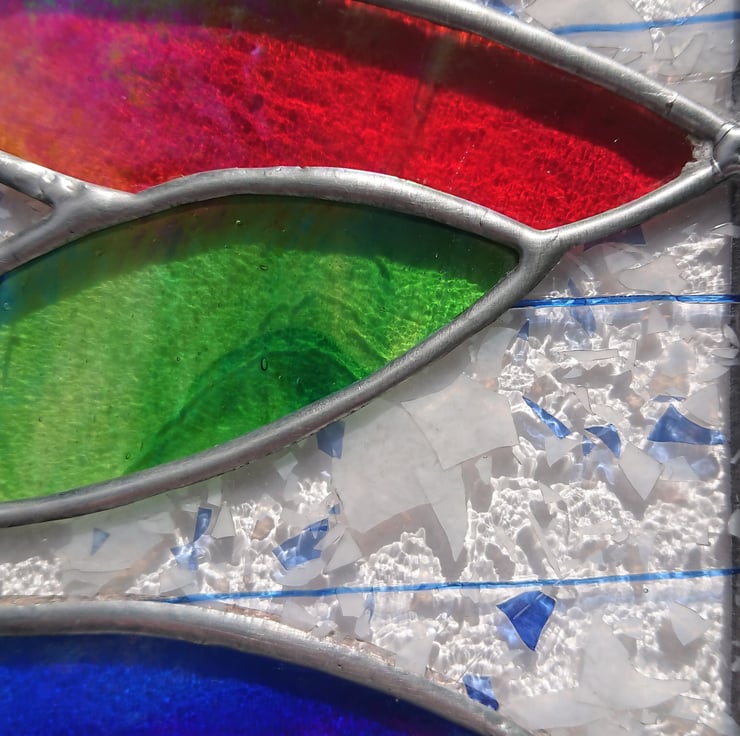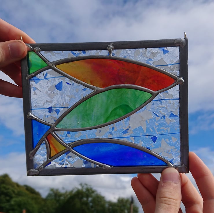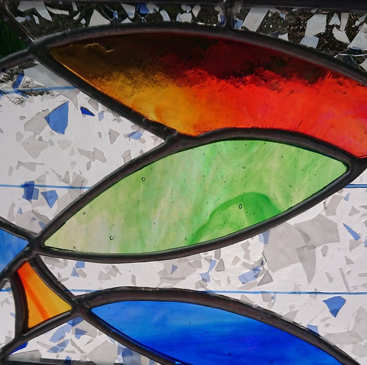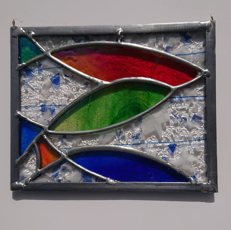 Three fish make up this design, each one in iridescent glass which shines beautifully in reflected sunlight. One red, one green and one blue. The starting point for this design was actually the background. It is a clear glass with blue stringers (thin lines) and white and blue confetti (thin flakes of glass) fused into it. This led me to a watery theme, hence the fishes.
