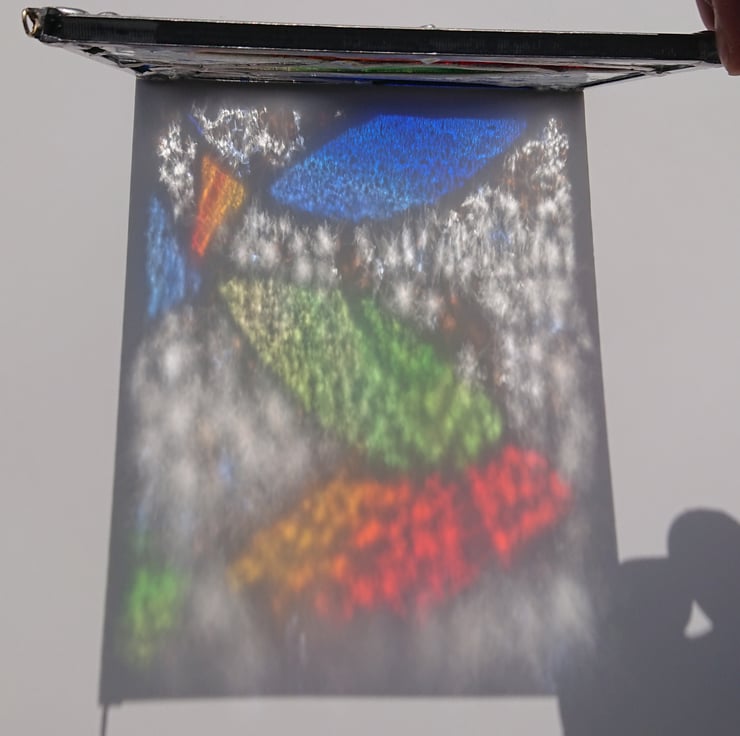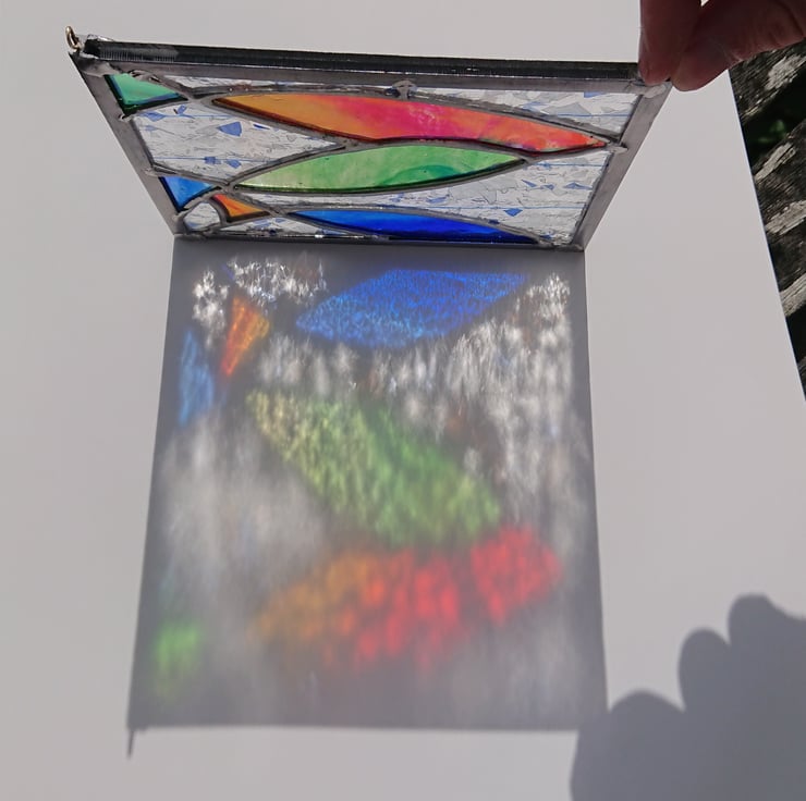 This panel is made with cut glass and copperfoil but I have also framed it with a lead came edge. The addition of the lead surround makes it a very sturdy, strong piece and gives the copperfoil panel a pleasing substantial weight.