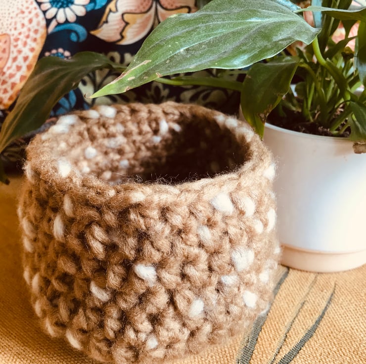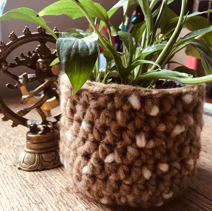 A bowl crocheted from a wonderfully soft and fluffy yarn. It is simple and clean but with a touch of softness. It can work in a modern minimalist or traditionally cosy home because of the neutral colours. It makes a perfect plant pot holder for your favourite house plant.