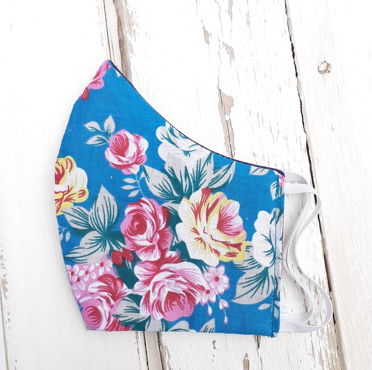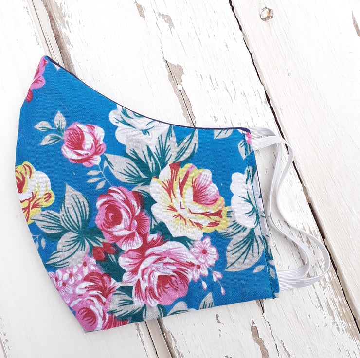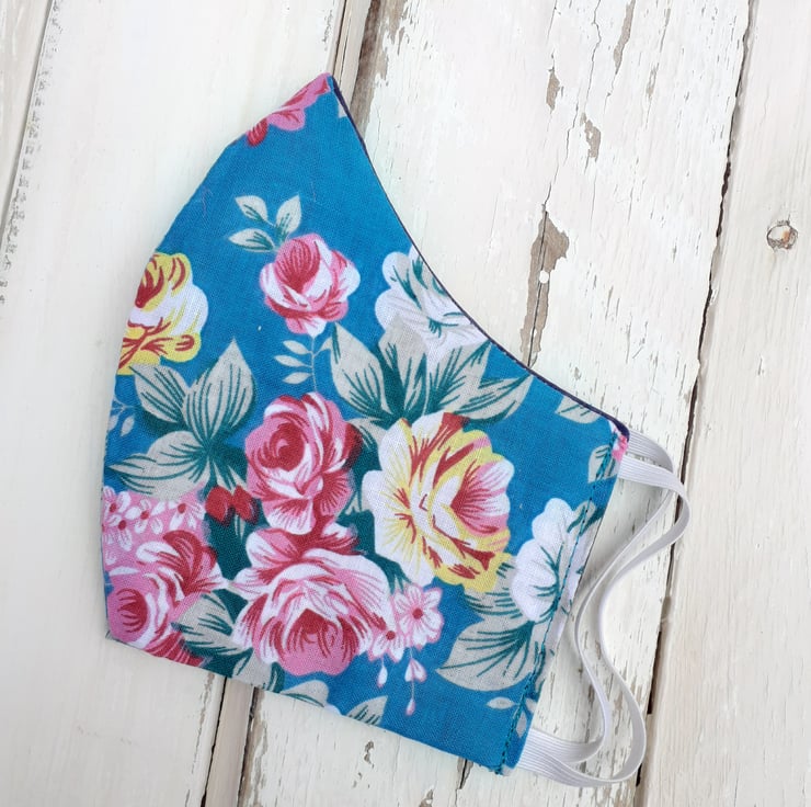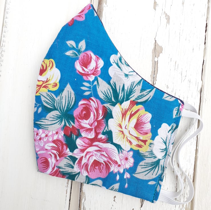 Teal with a floral pattern on one side navy blue cotton on the other.