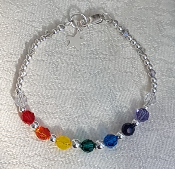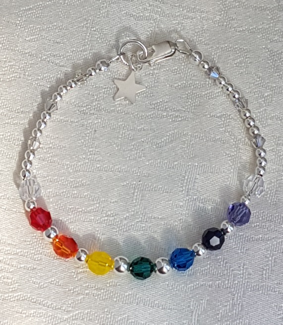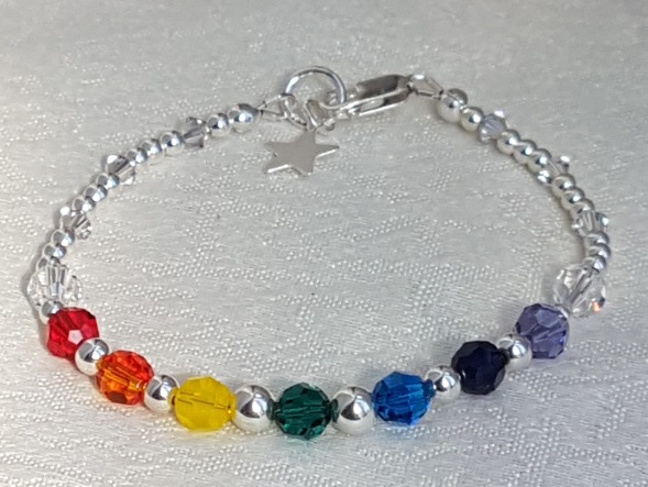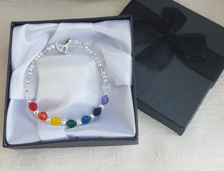 Gorgeous Rainbow Crystal and Sterling Silver Bracelet. A fabulous array of Rainbow colours and small Sterling Silver beads make this a beautiful subtle bracelet with a pop of colour at the front. 6mm round crystal beads in the colours of the spectrum only interrupted by gorgeous Sterling silver 5mm, 4mm and 3mm beads. A beautiful gift in crystal and Silver.