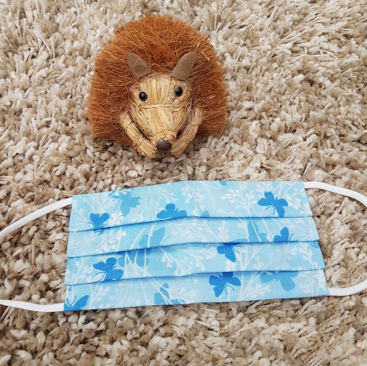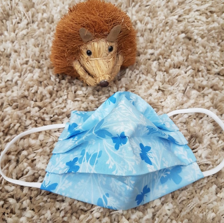 Small Adult/Teenager face covering made from a blue butterfly print on pale blue cotton. The face mask is made with 2 layers of cotton forming an inner pocket for a filter (not included) and is fastened over the ears with 2 loops of elastic.