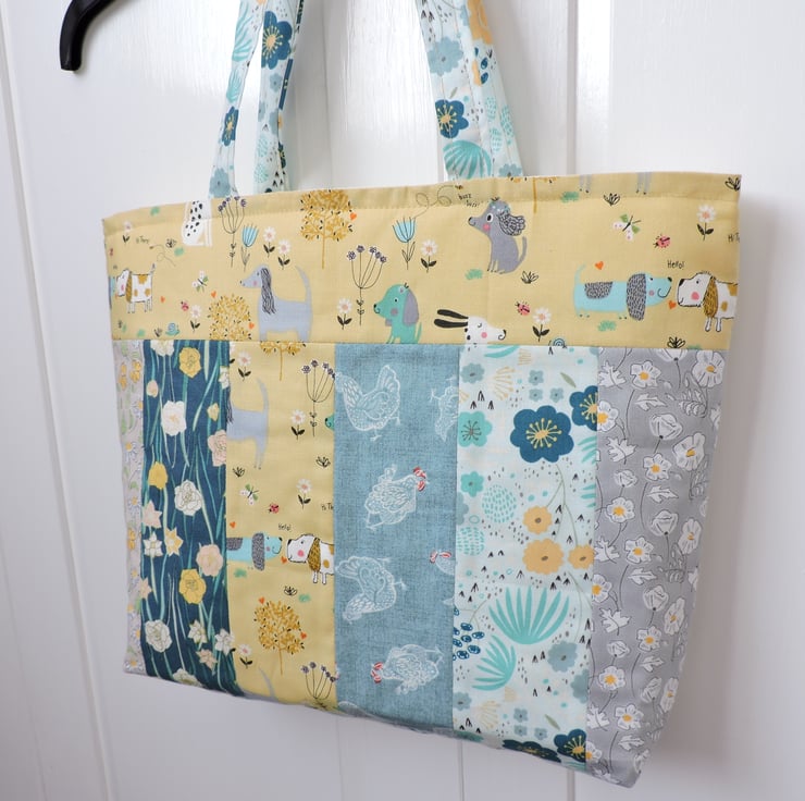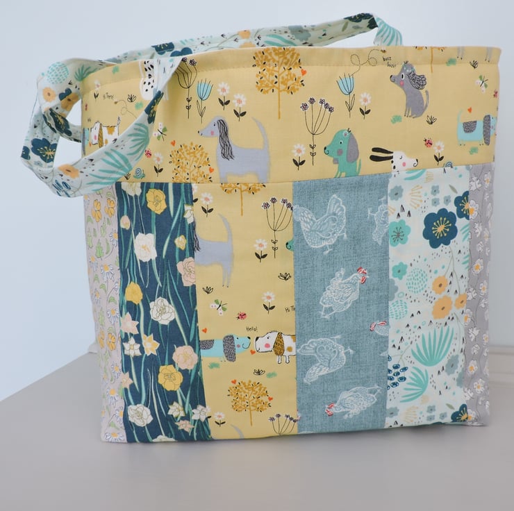 SALE was £14.00 now £10.00 A handy patchwork tote bag,craft bag, book bag made with an assortment of cotton fabrics depicting various themes of flowers, dogs and chickens. Co-ordinating colours of yellow, aqua, teal, grey,and white. Fully lined with a cream cotton fabric. This bag has 2oz wadding to give a lovely soft padding, it has a squared off bottom, and two handles.