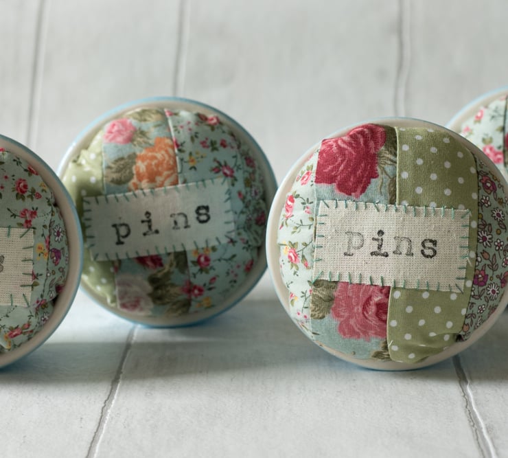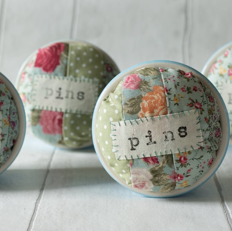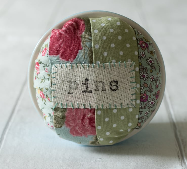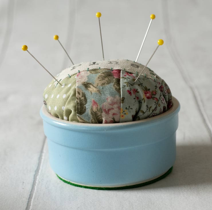 This handmade pincushion uses a duck egg blue ramekin for its base to provide a steady item to have at hand for machine or hand sewing. The cushion part is made of patchworked cotton and features the word "Pins" printed on a hand appliquéd calico label.
