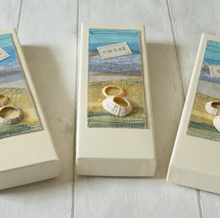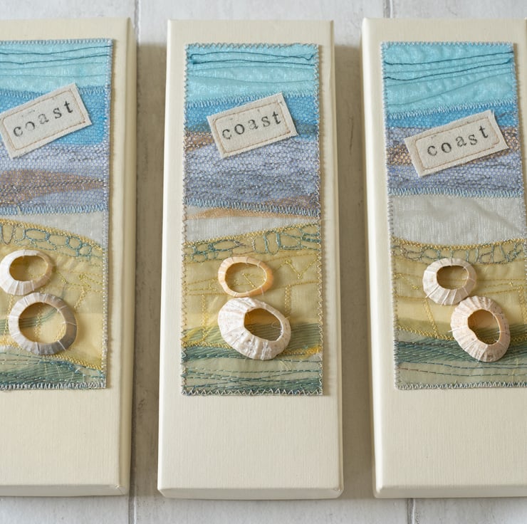 The decorative panel has been made using a variety of fabrics including net and organza and features free motion machine embroidery - "drawing" with a sewing machine needle. The panel is finished with a printed calico "COAST" label and real shells from Scotland.