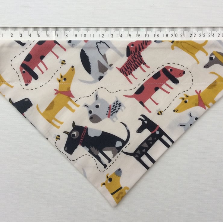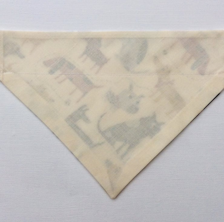 This cute, over the collar, slide on, small to medium dog bandana is handmade from cotton fabric with dogs on a cream background. It is lined with a cream cotton fabric.