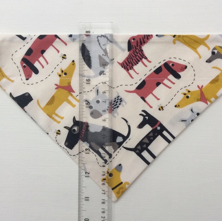 The bandana measures approximately 26.5cm on the neck edge and 18cm from neck edge to the point. The bandana has a channel through which the dog’s own collar is threaded. It will fit a collar with a width up to 4cm.
