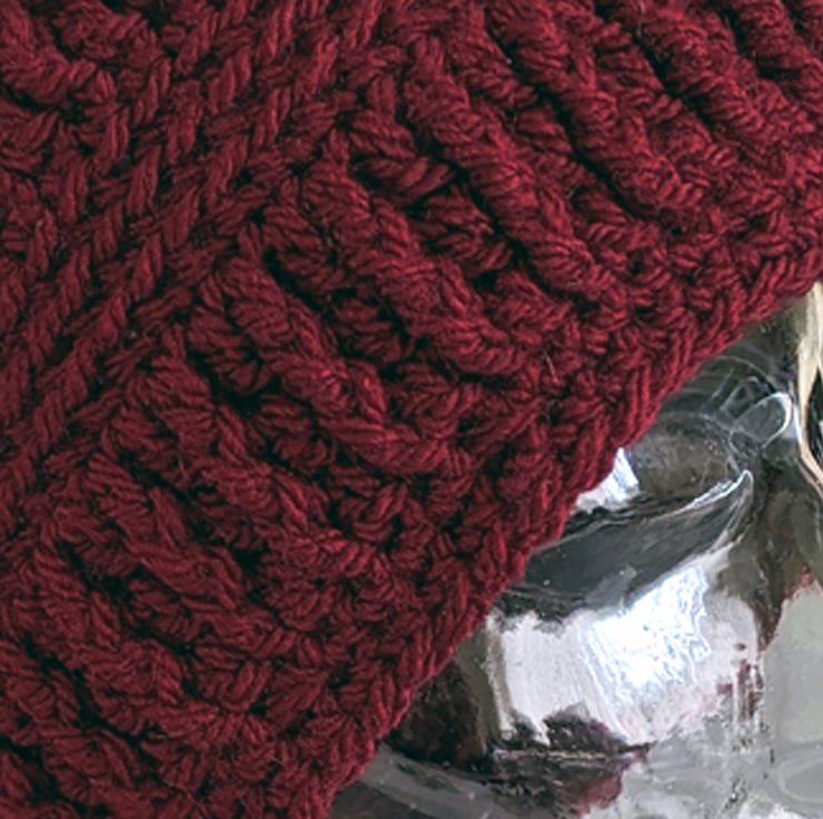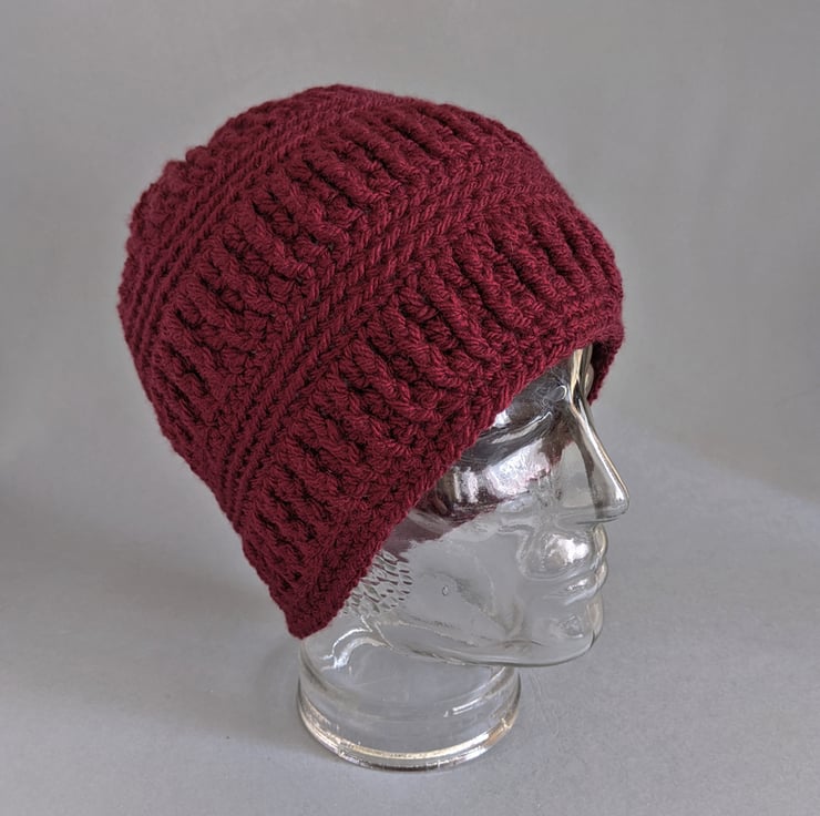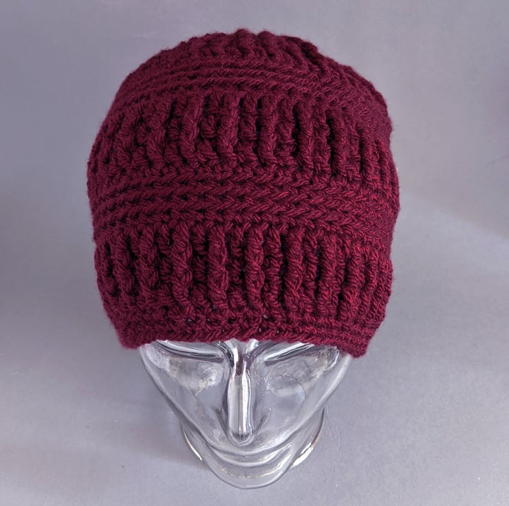 Keep your head warm on winter walks with this cosy handmade dark red wine coloured beanie hat.