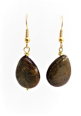 Semi-precious gemstone pear shaped snake skin jasper is the feature of these earrings
