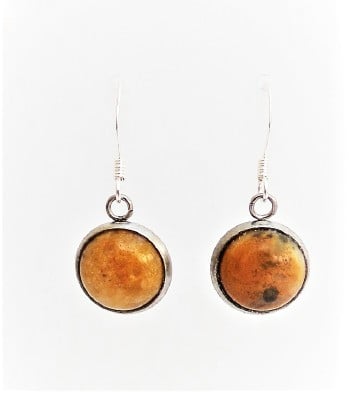 The gemstone used in these earrings crazy lace agate cabochon that have been inserted into the silver plated tray. They are a lovely shade of ochre yellow. The ear hooks are silver plated flattened shepherd style.