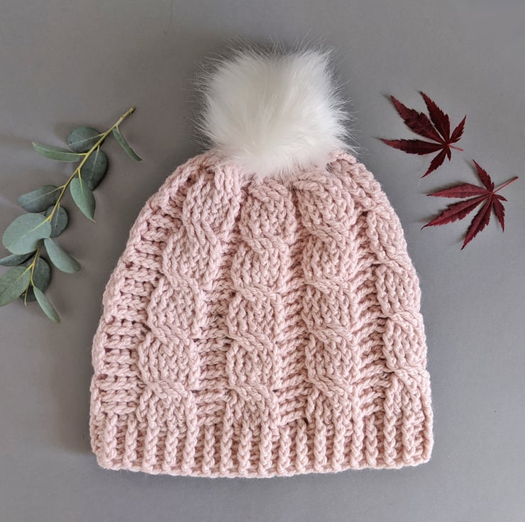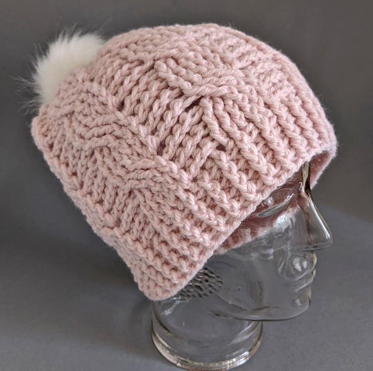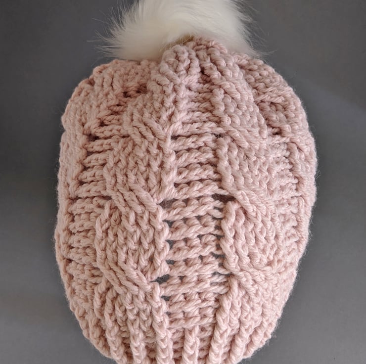 Keep your head warm on winter walks with this gorgeous handmade powder pink cabled beanie hat with white faux fur pom-pom.