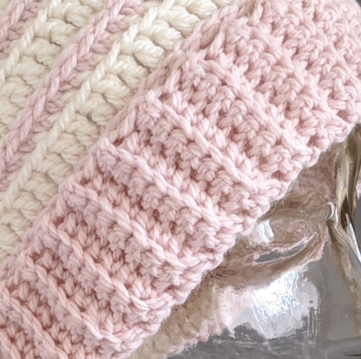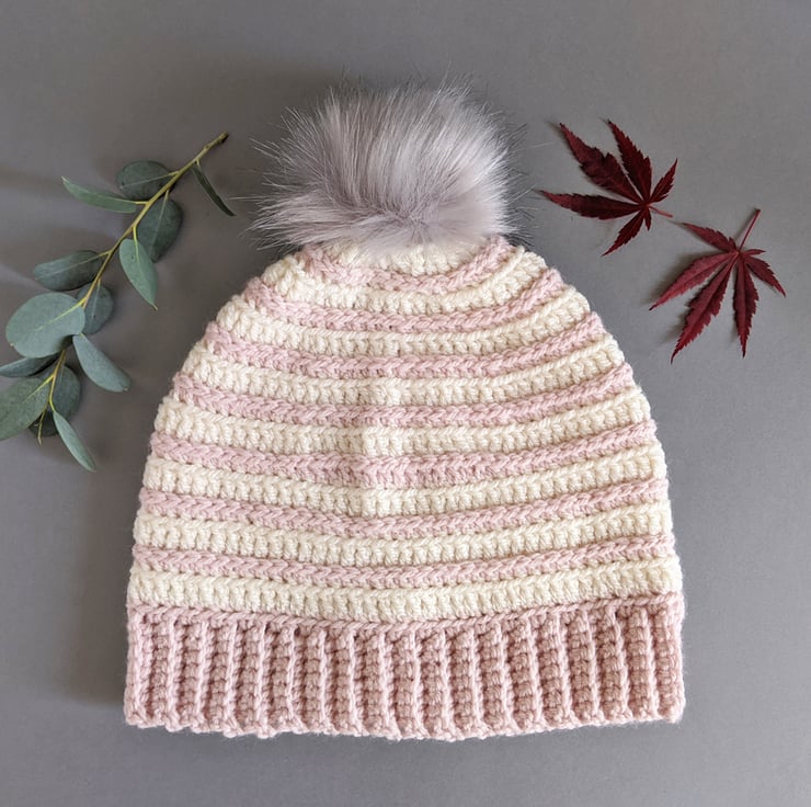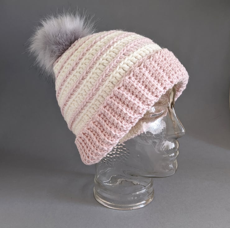 Crocheted from an aran weight wool/acrylic blend yarn this wonderfully textured hat features a striped pattern in pink and cream with braid style stitches and ribbed brim. It is soft and warm and the complimentary silvery grey faux fur pom-pom can be removed for ease of washing. The pom-pom is held in place with a metal popper.