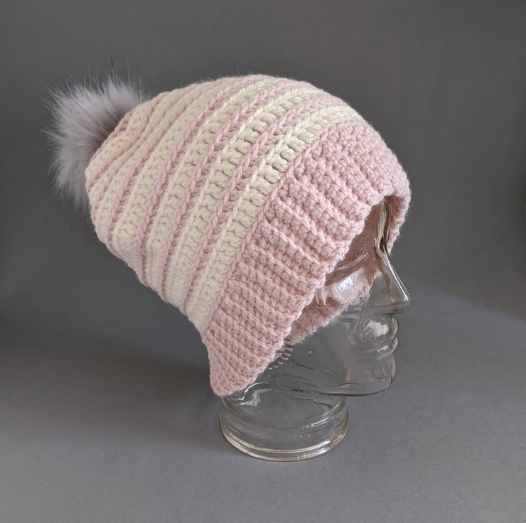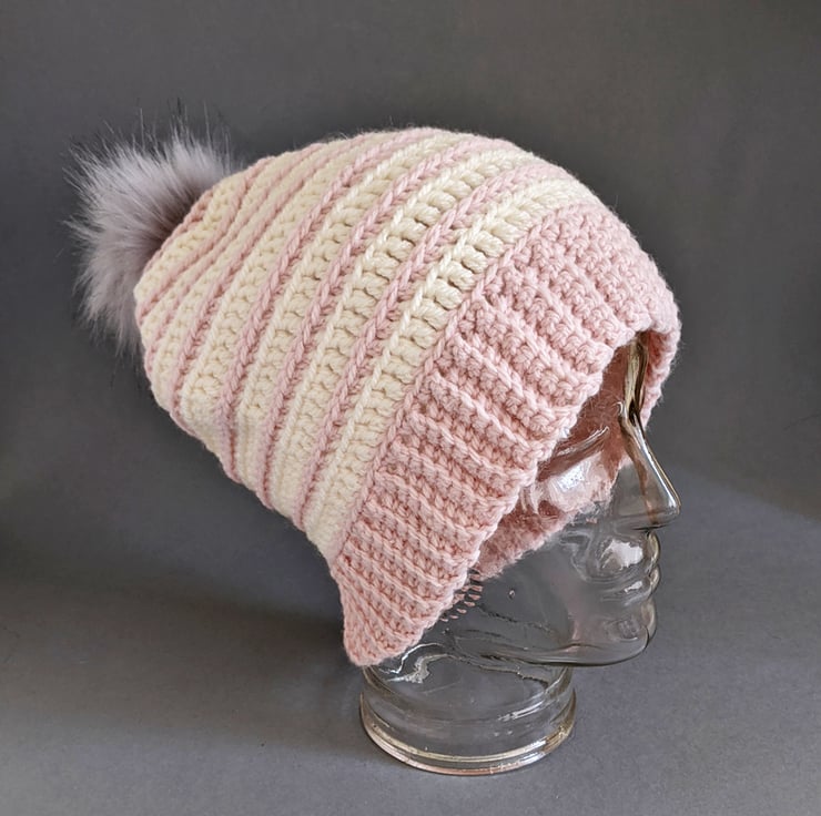 Keep your head warm on winter walks with this gorgeous handmade powder pink and cream striped beanie hat with grey faux fur pom-pom.