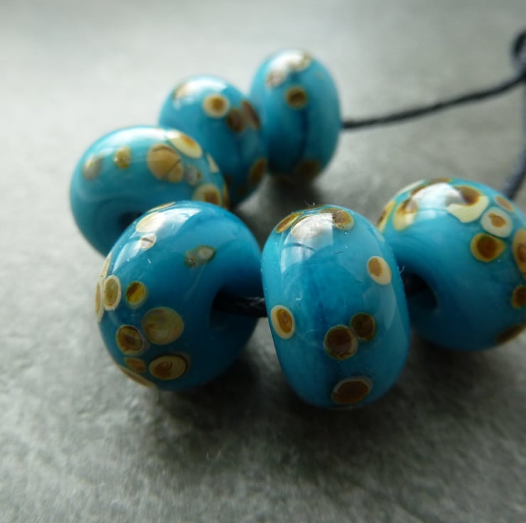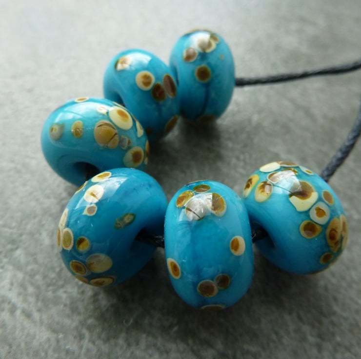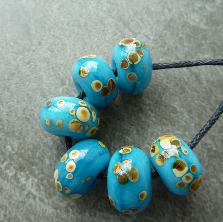 A set of 6 lampwork glass beads made with blue glass and rolled in raku frit.