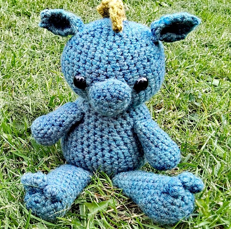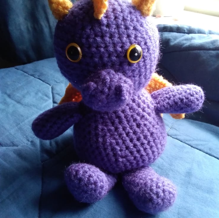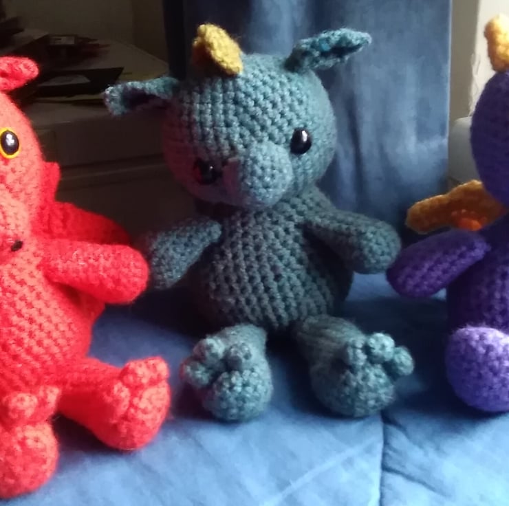 Crochet dragons and dinosaur sitting approximately 13cm tall. Made from acrylic wool and Polyester stuffing with safety eyes.