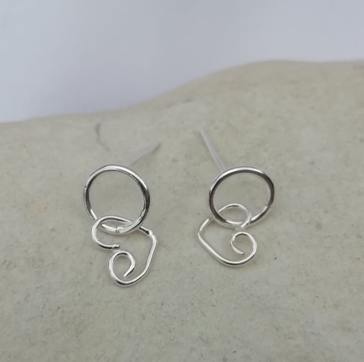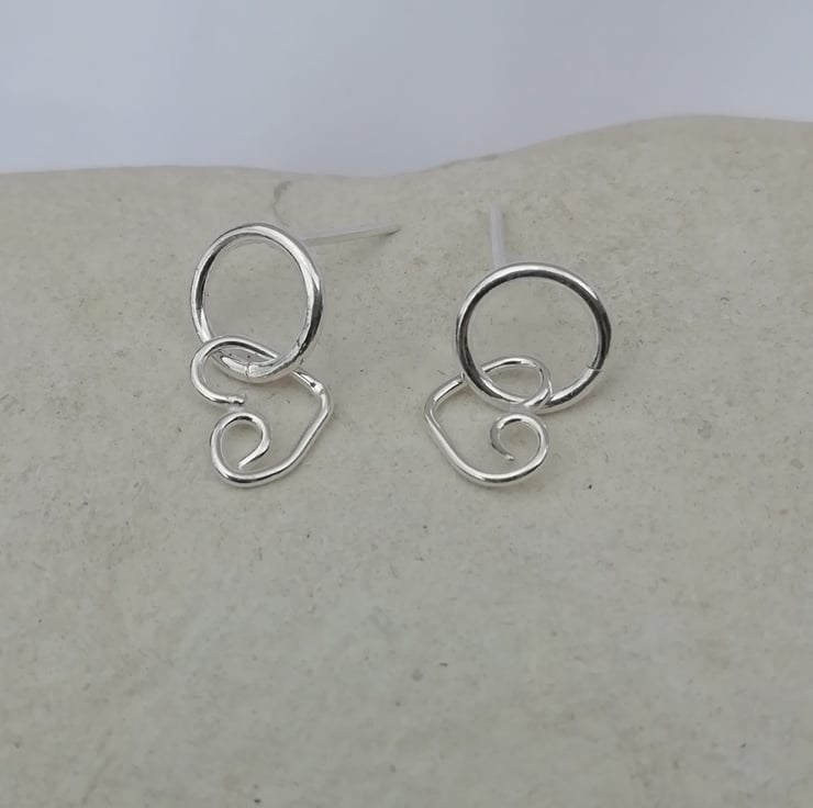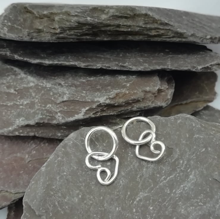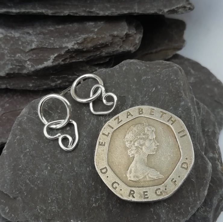 A heart made of twisted silver wire is hung on a 8 mm sterling silver hooped ear stud.