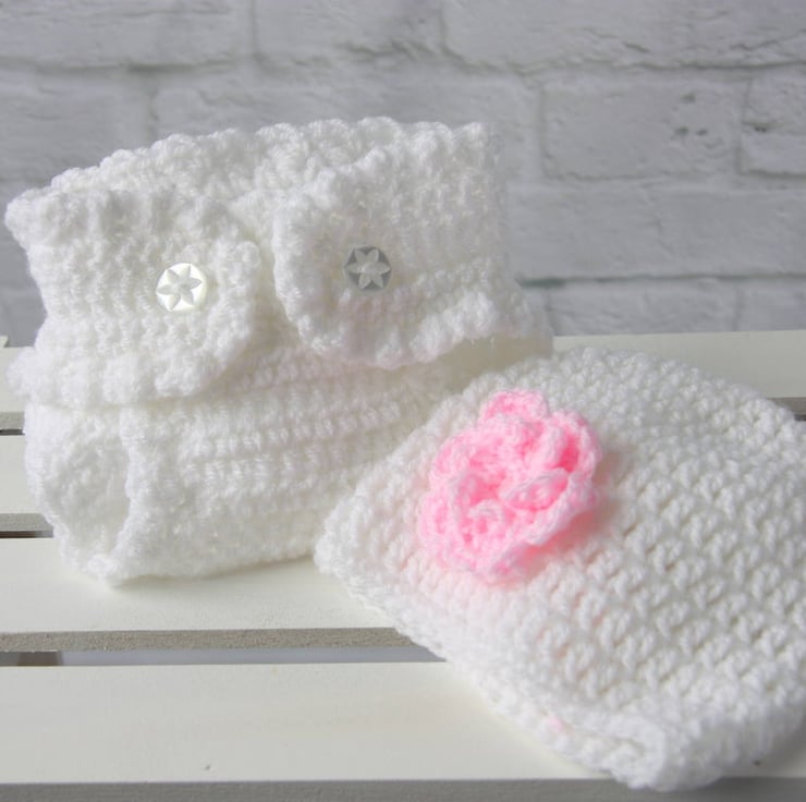 Crochet Baby Blanket, Diaper Cover, Baby Beanie Hat Gift Set in Pink and White