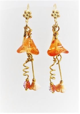 Pretty dangly earrings featuring Czech glass petal beads and crystals. With gold plated wire and lever back ear hooks for pieced ears only.