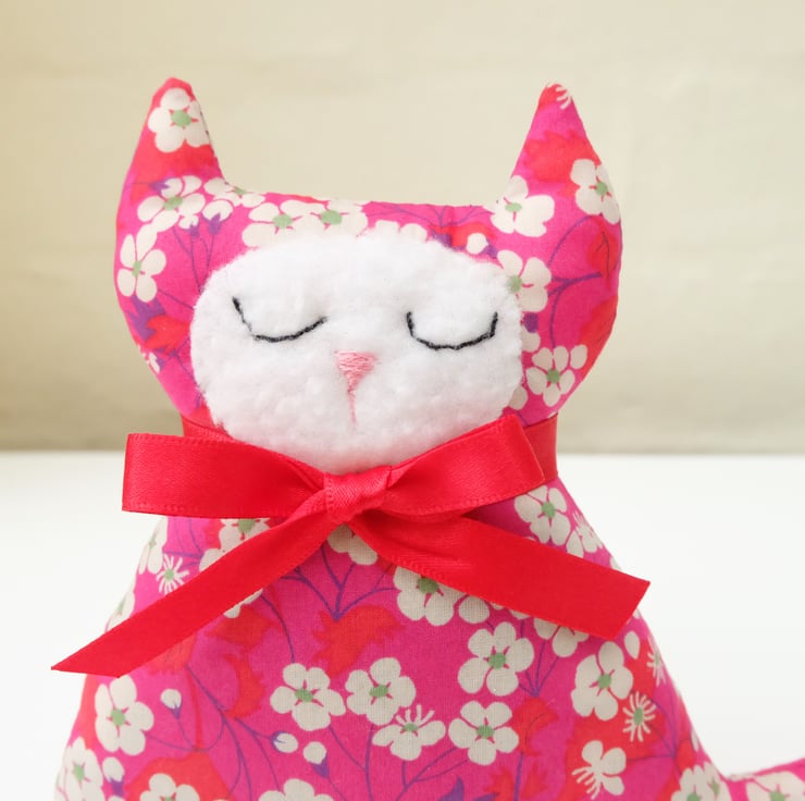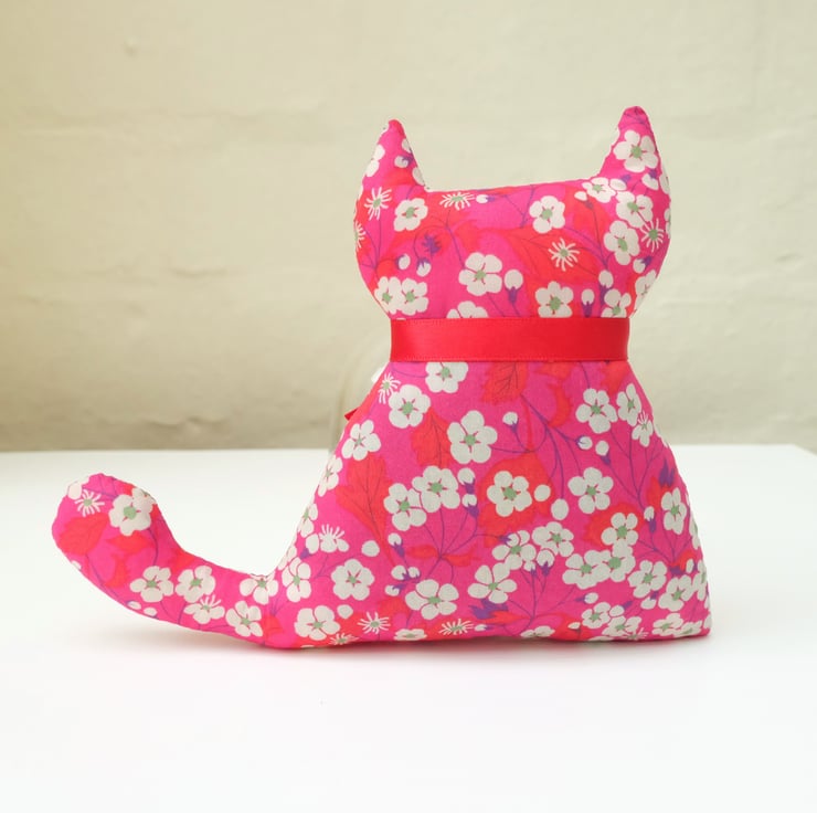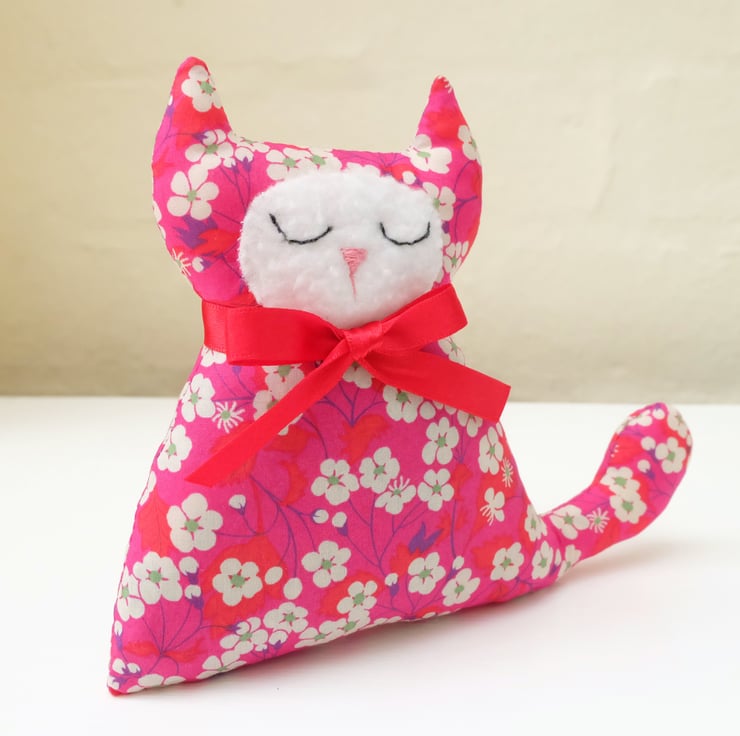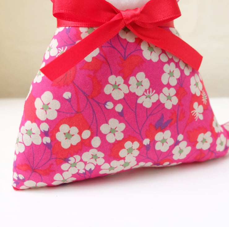 This lavender cat is made using lovely Liberty Mitsi fabric, in hot pink and red. It makes an ideal pretty gift for a cat lover! Place the cat into bedroom drawers to sweetly scent clothes, or sit it on a pillow to aid a restful night's sleep.