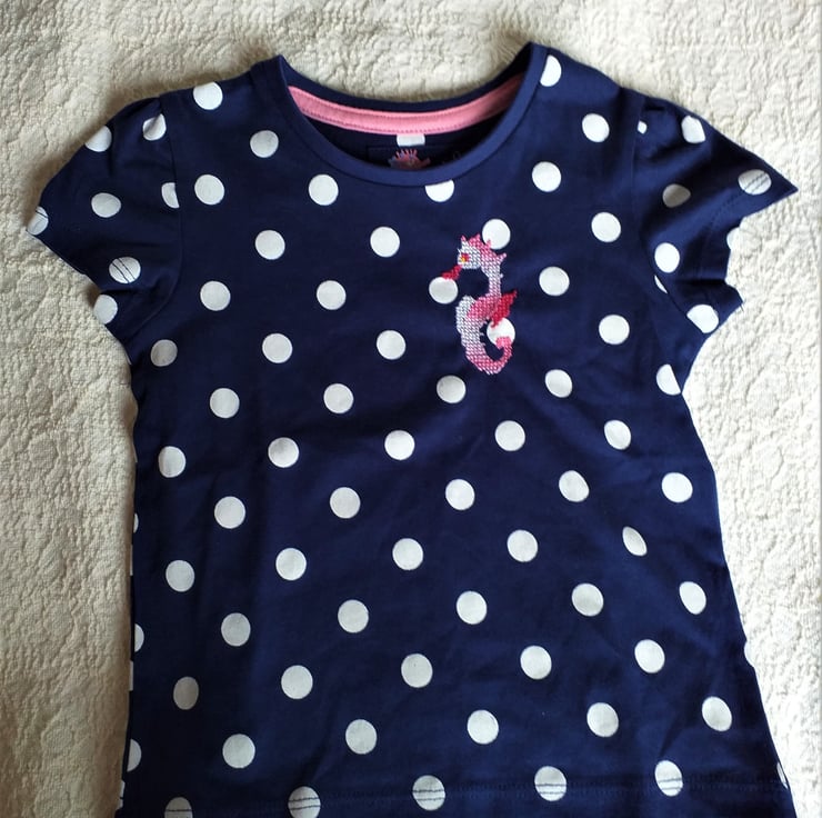 Here's an absolutely gorgeous little navy T-shirt with white spots. I have hand-embroidered a variegated pink seahorse on the left front. Because of its position among the spots, the seahorse appears to be blowing a bubble! The shirt has short sleeves lightly gathered on the shoulder, is 100% cotton and machine washable.