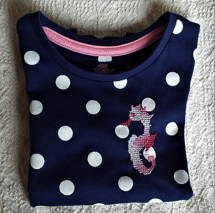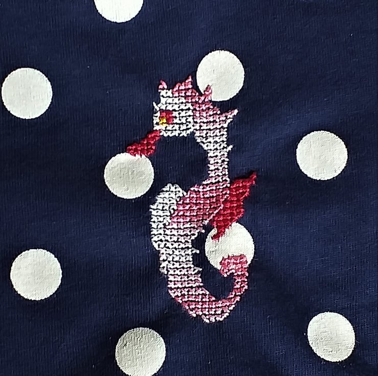 It took me a long time to decide what to embroider on this very pretty navy spotted background. It struck me that the spots looked like bubbles in a midnight sea, so what else but a fish? The pink band inside the neck suggested the colour, and the seahorse printed on the label clinched it!