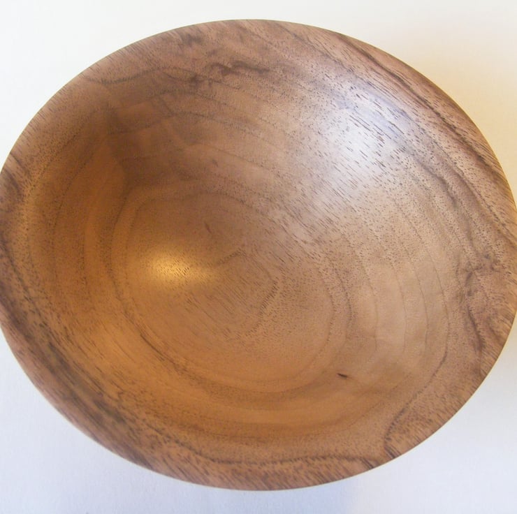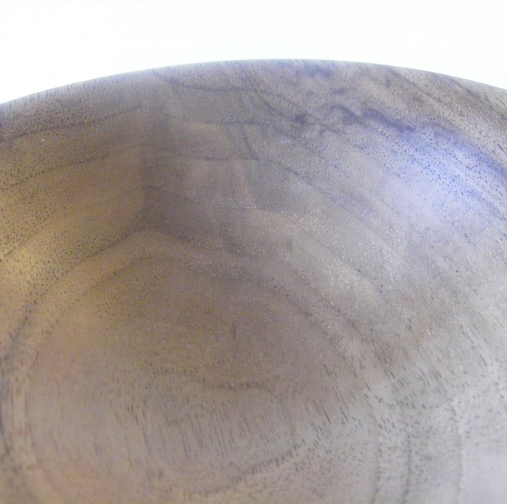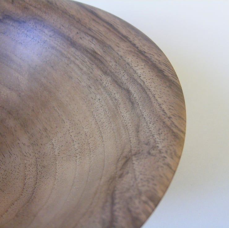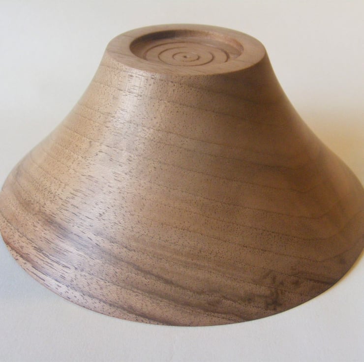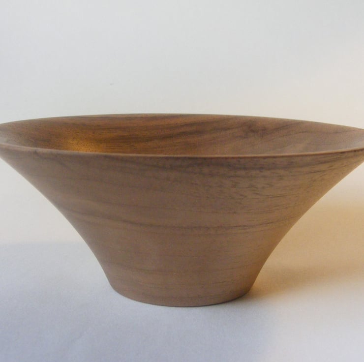 Walnut bowl, 145 x 58mm high, finished in paste wax. A beautifully shaped and thin Walnut decorative bowl. The outside of the bowl has a reverse curve, resulting in a delicate trumpet shape.